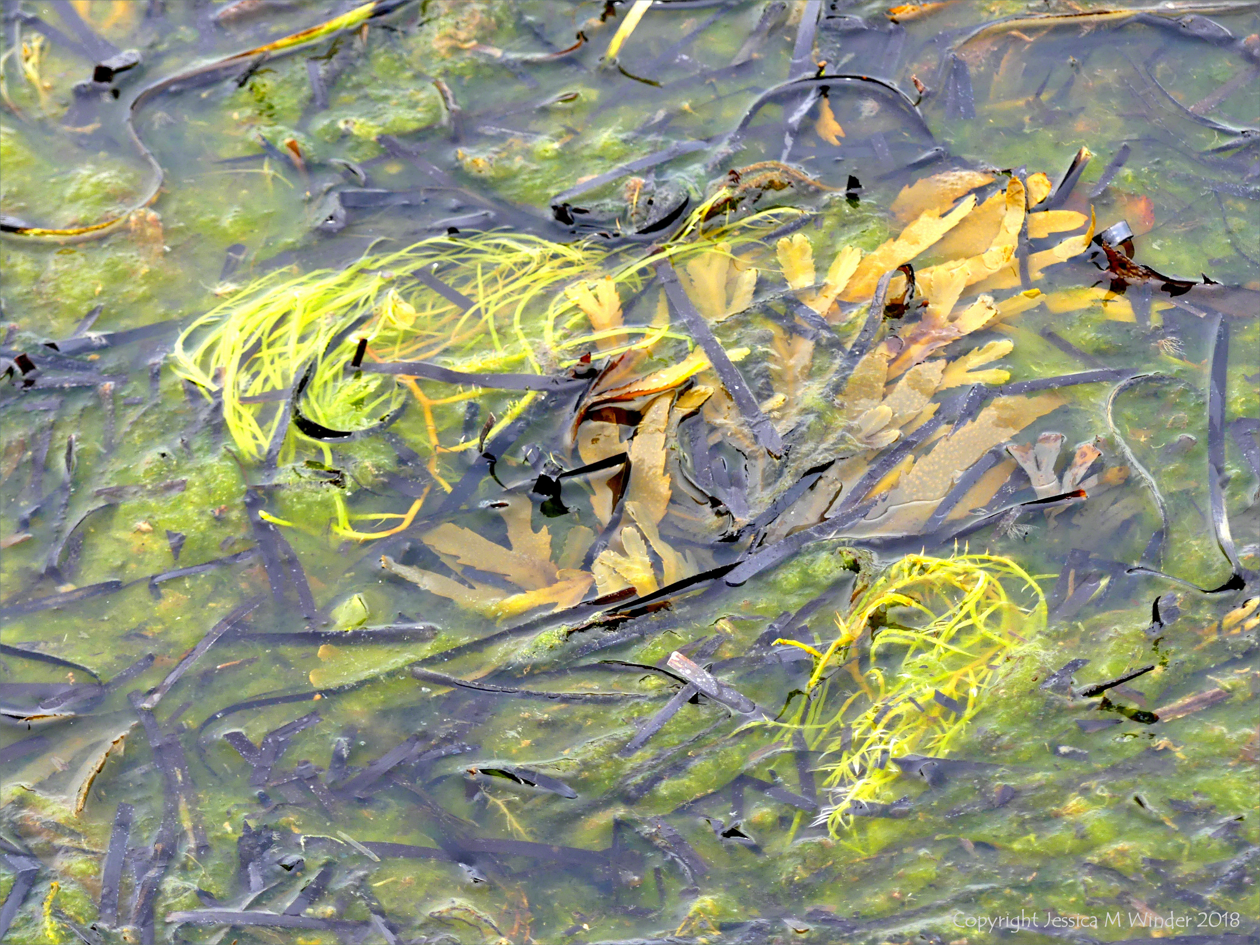 Seaweed Rafts Studland 8 – Mixed varieties of detached common British seaweeds and eel grass floating in shallow water