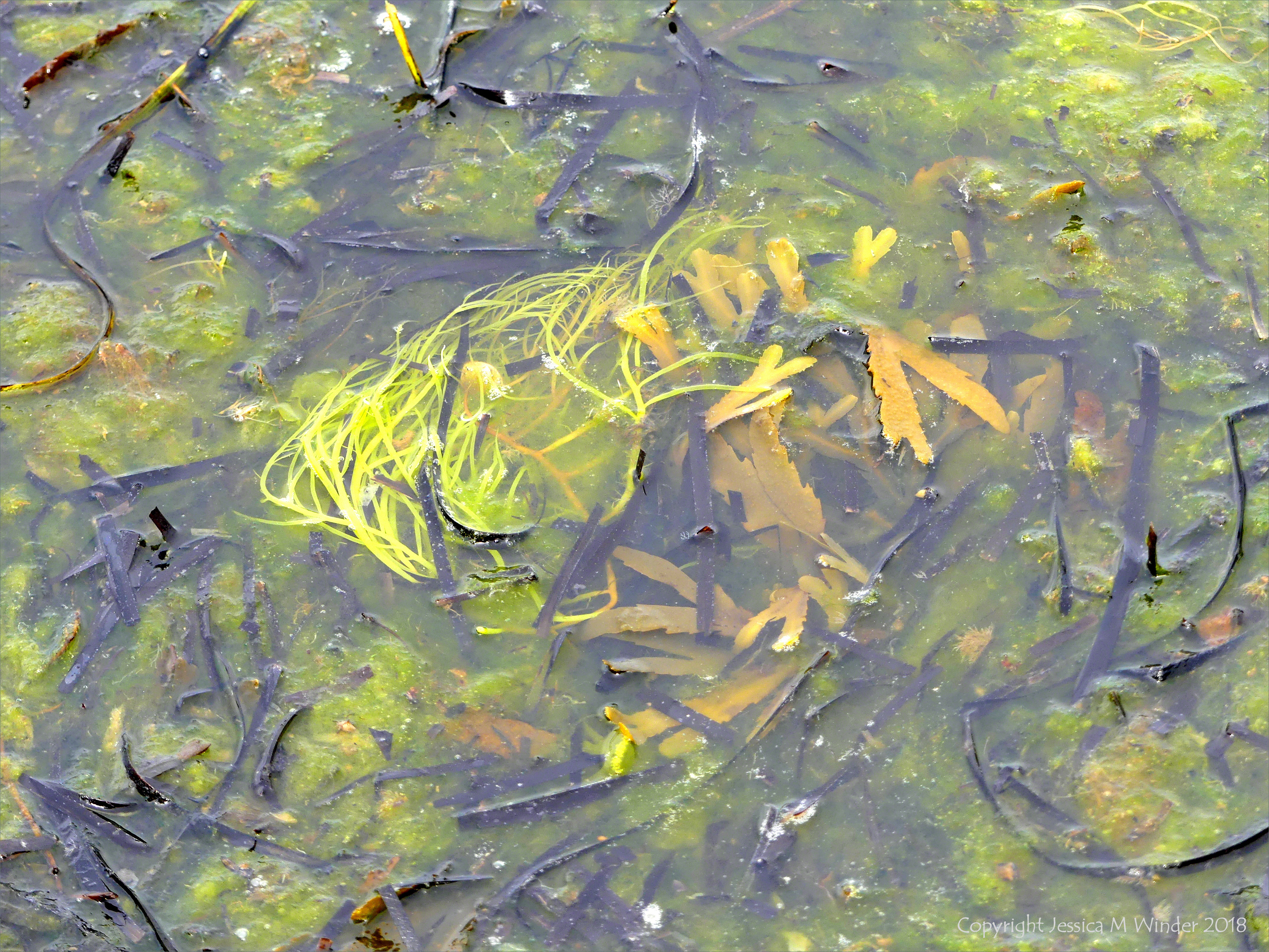 Seaweed Rafts Studland 13 – Mixed varieties of detached common British seaweeds and eel grass floating in shallow water