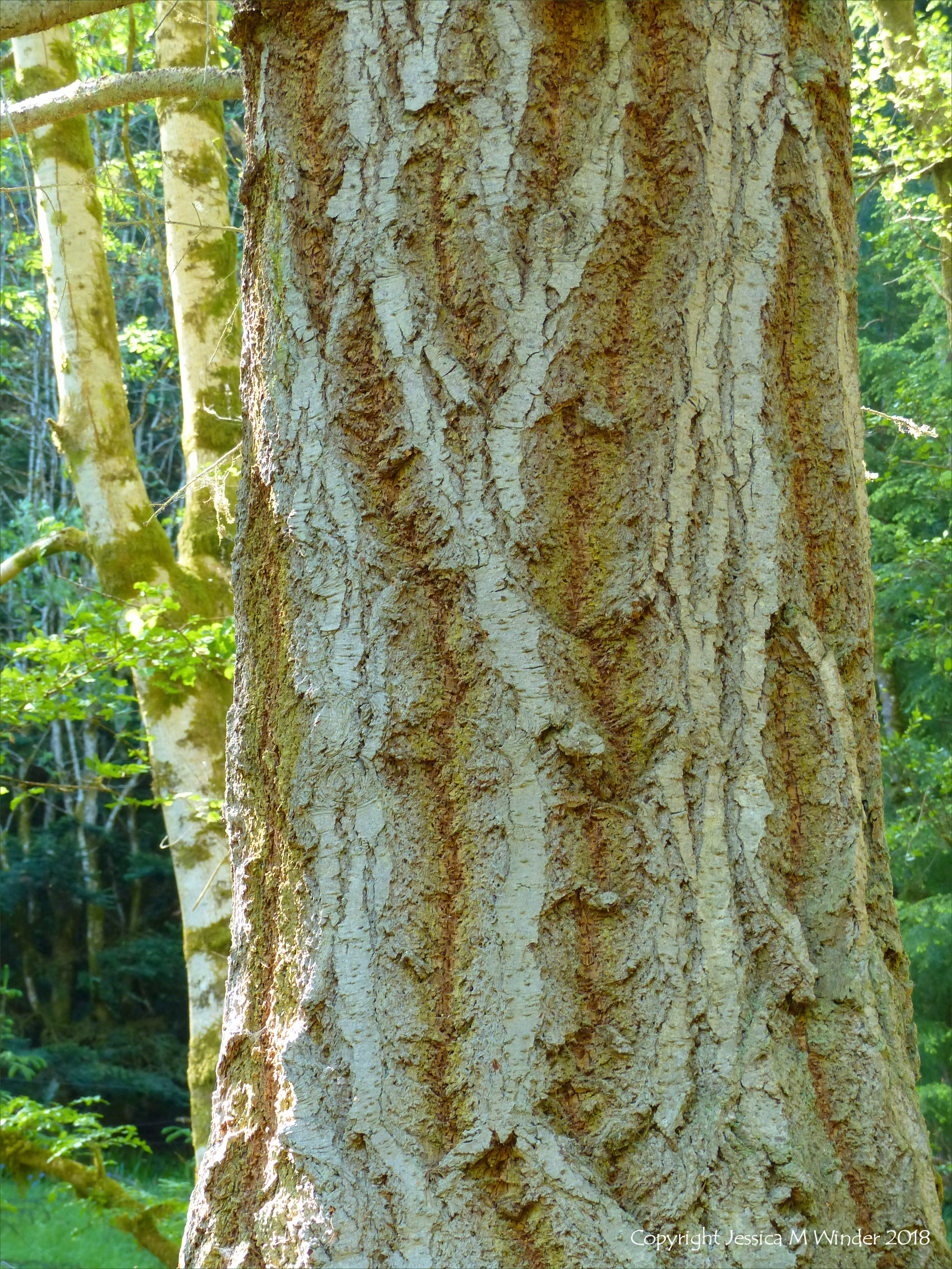 Farigaig 8 – Nature with coniferous tree with interesting bark pattern and texture on higher hillside slopes along the Farigaig forest trail on the banks of Loch Ness in Scotland June 2018