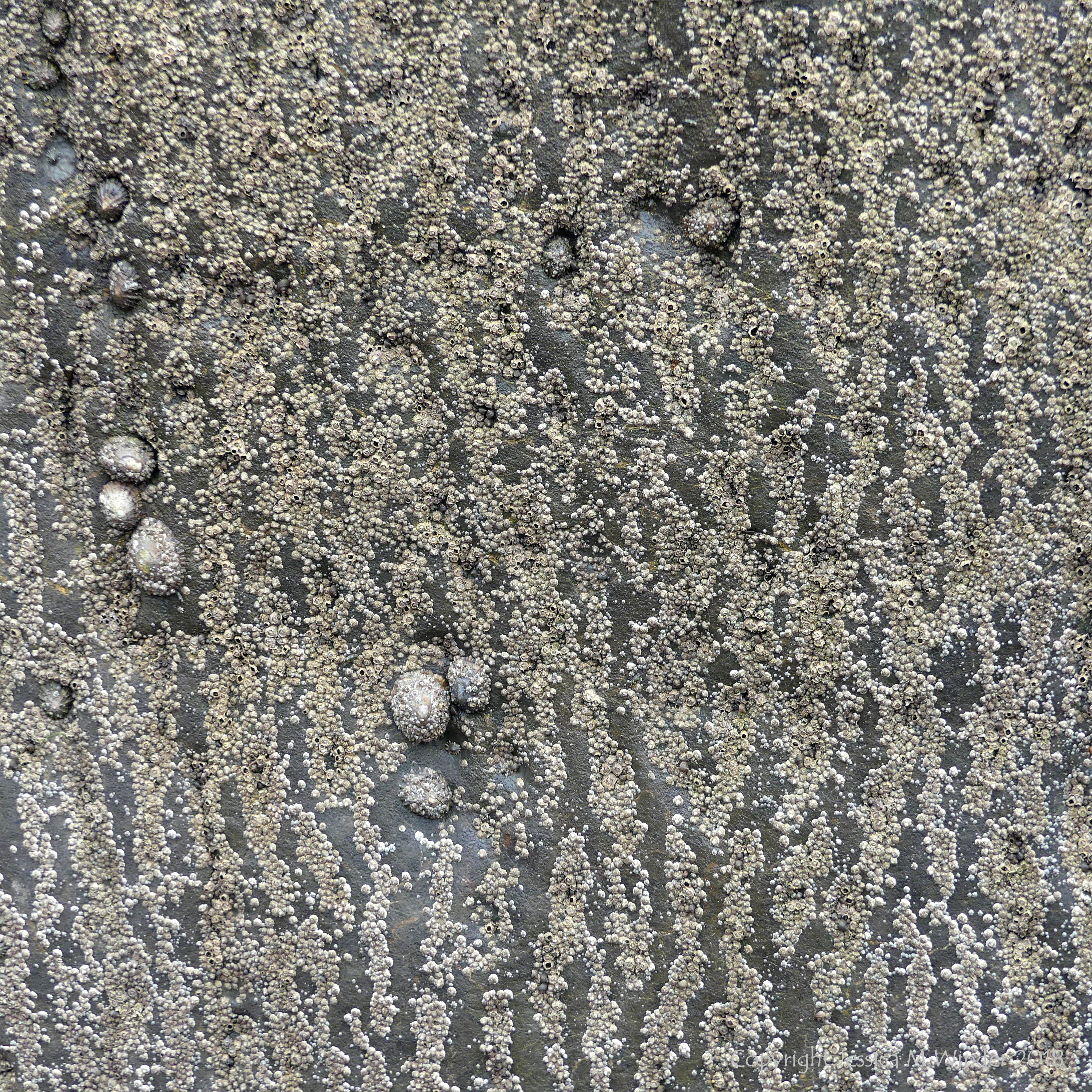 On the rocks at CB21 – Vertical stripes of barnacle and limpet encrustation on seashore outcrop of Carboniferous Limestone at Caswell Bay in Gower.