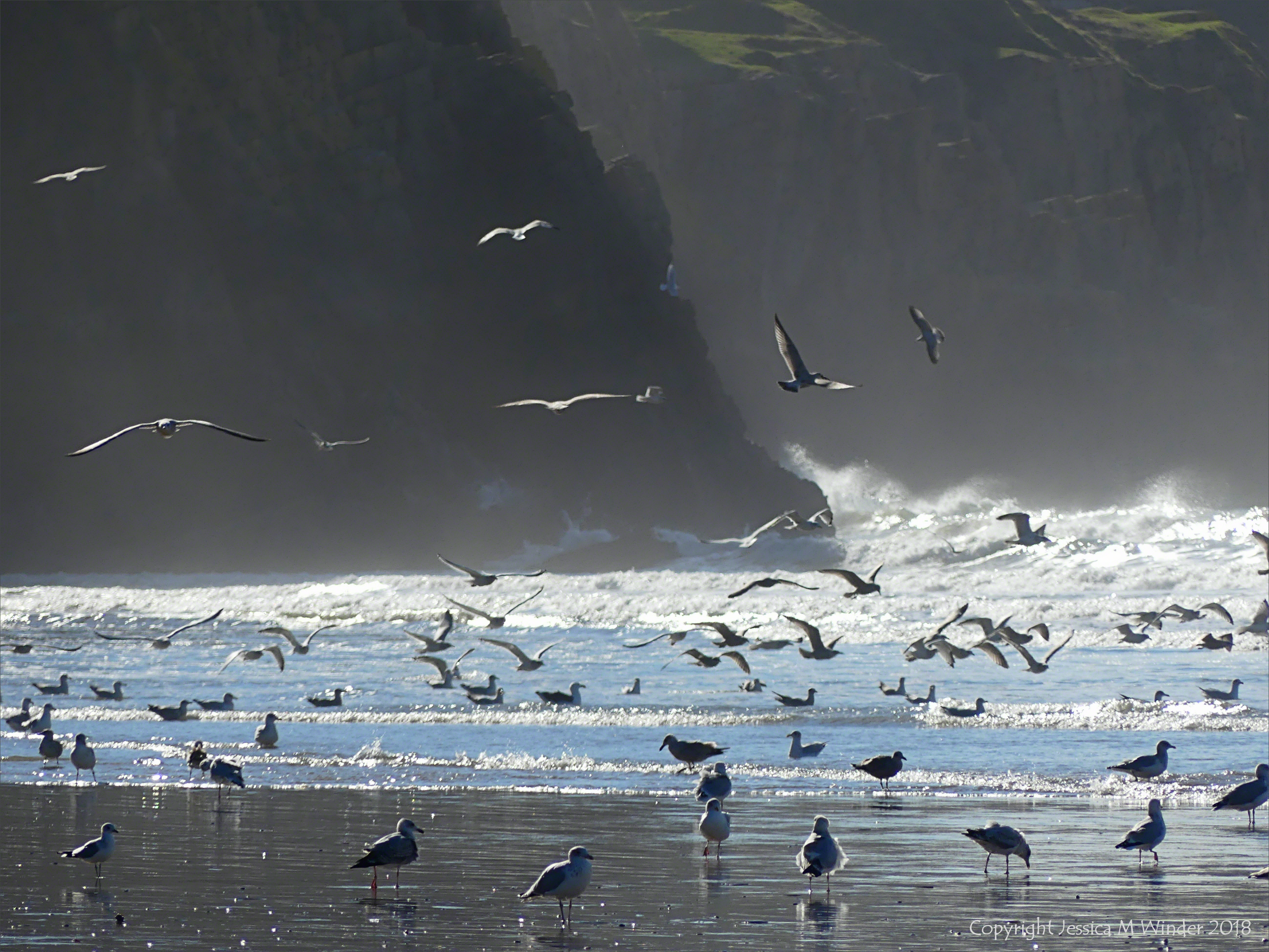 Seabirds Seashore 2 – Gulls gathered on the sand to fish in the choppy sea and surf after Storm Callum. Photographing into the sun seemed to capture the delightful and somewhat mystical atmosphere of the moment.