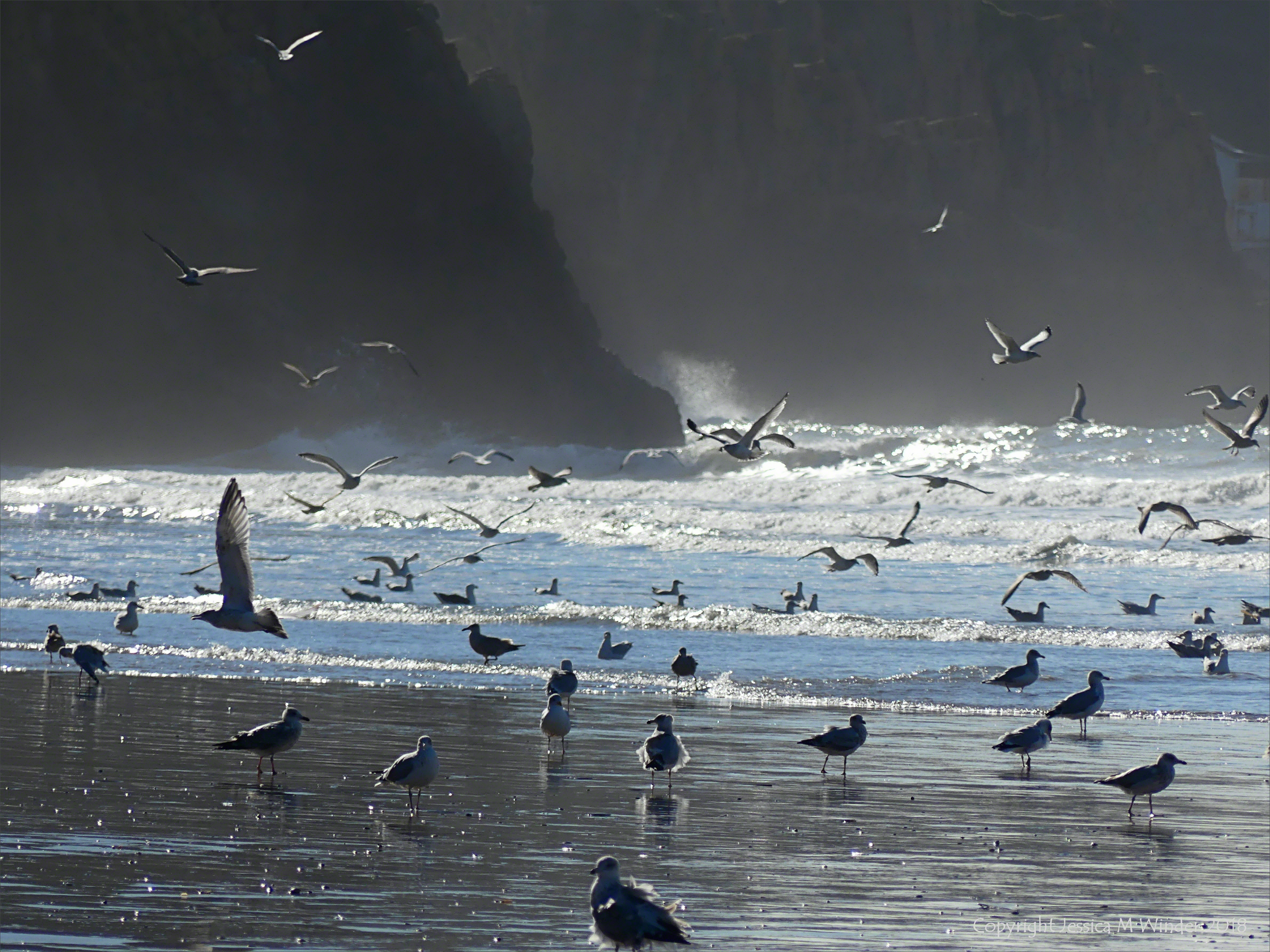 Seabirds Seashore 3 – Gulls gathered on the sand to fish in the choppy sea and surf after Storm Callum. Photographing into the sun seemed to capture the delightful and somewhat mystical atmosphere of the moment.