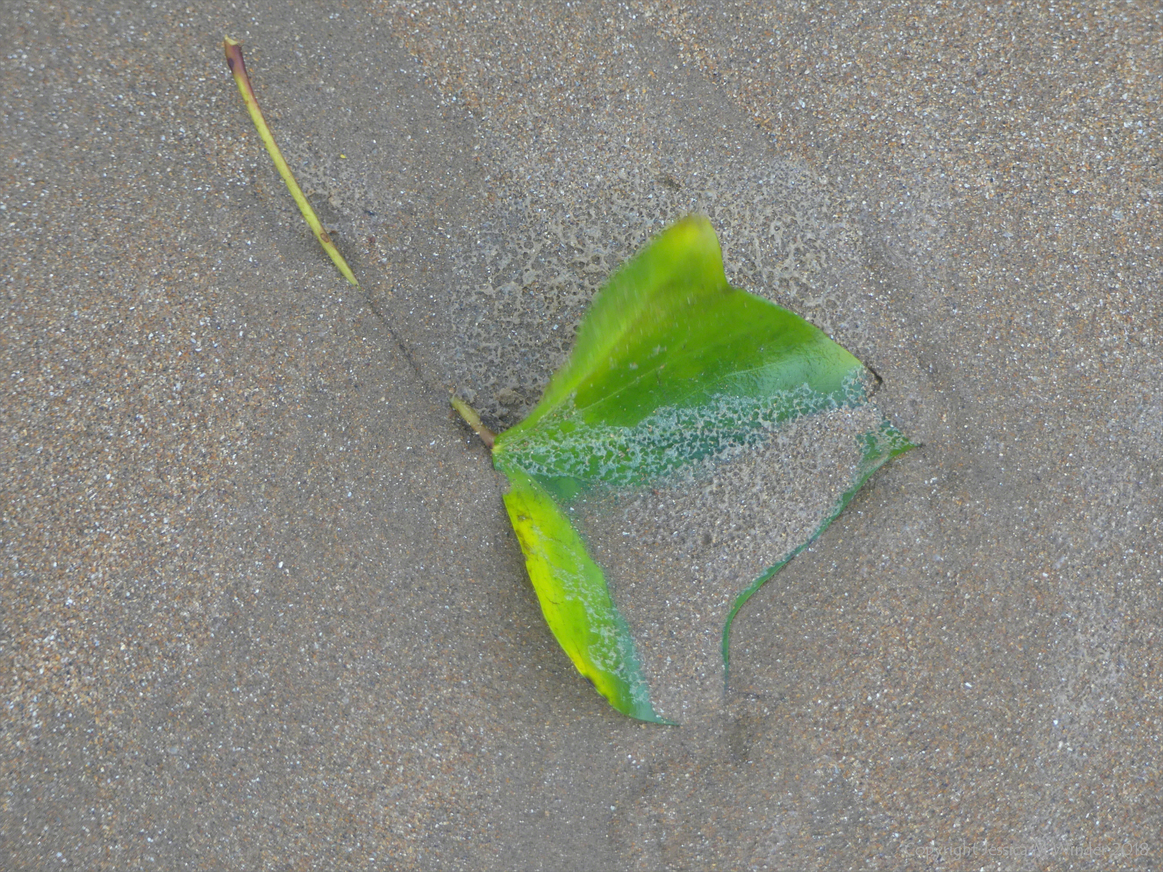 Storm Swept 3 – Leaf anchored by wet sand on the beach after a storm (Swansea Bay after Storm Callum October 2018)