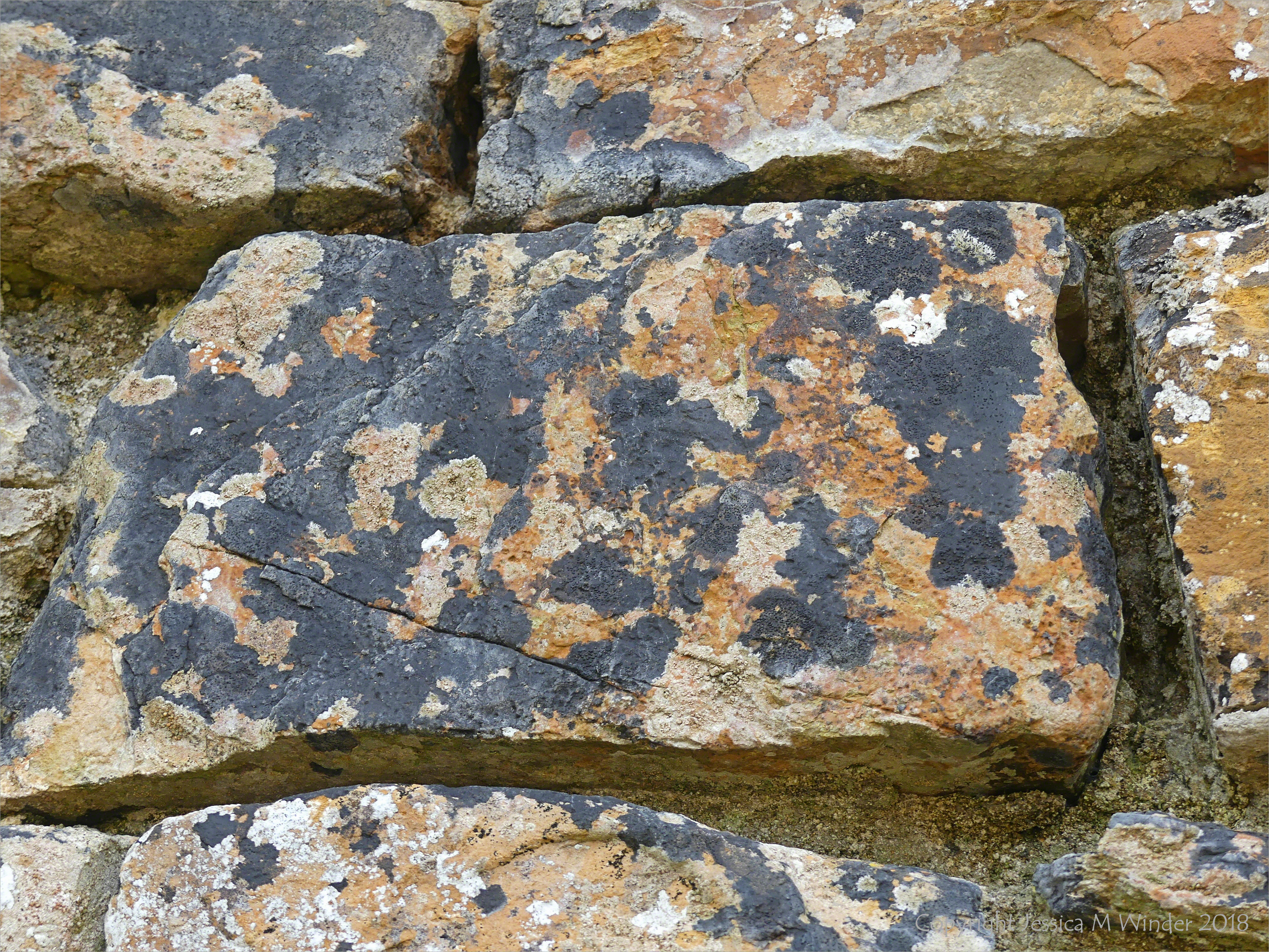 Stone Texture at Broch of Gurness 15 – Natural patterns and textures of Devonian sedimentary rocks (often covered with lichens) used for the building stonework for an ancient archaeological site.