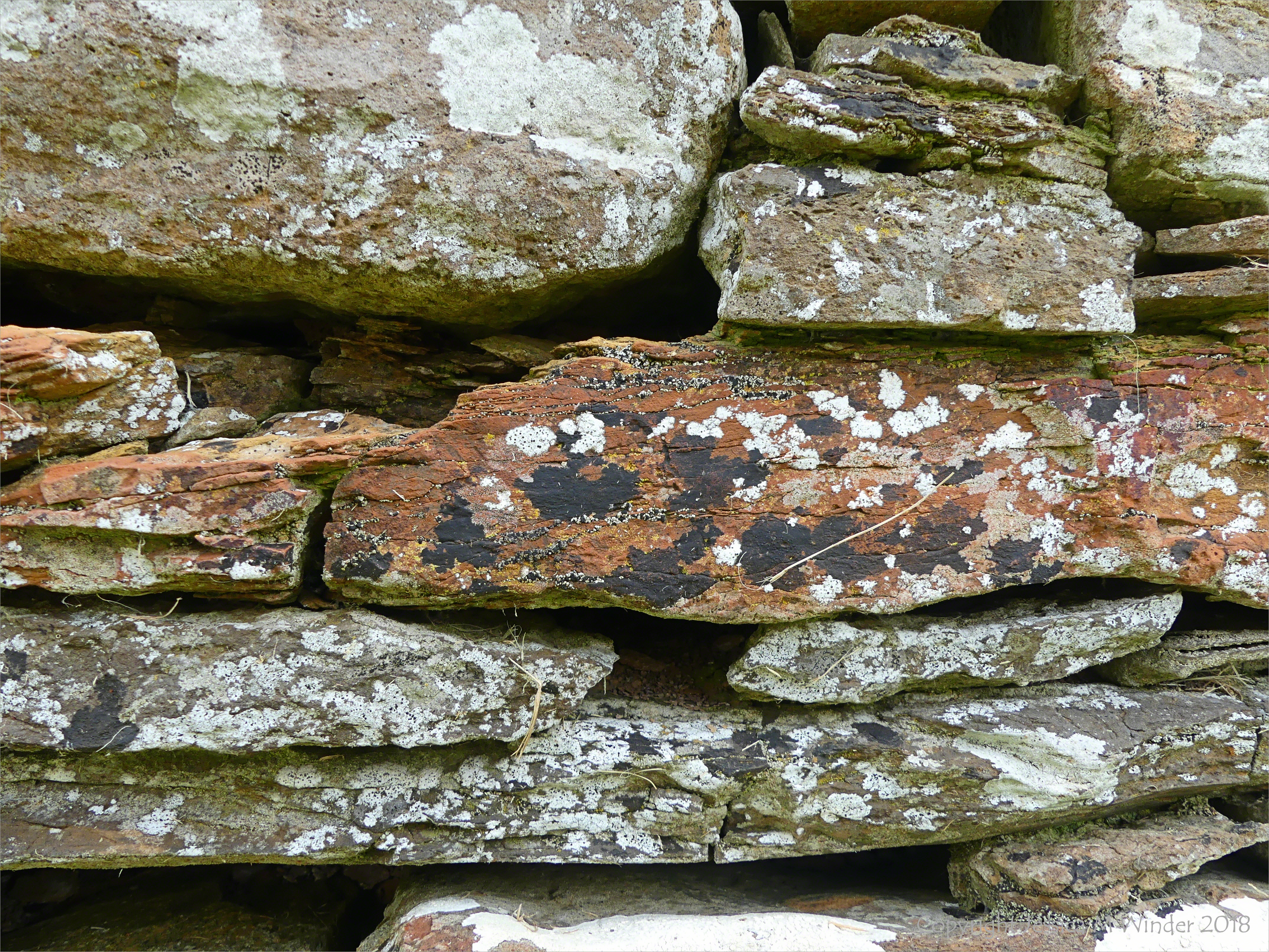 Stone Texture at Broch of Gurness 21 – Natural patterns and textures of Devonian sedimentary rocks (often covered with lichens) used for the building stonework for an ancient archaeological site.
