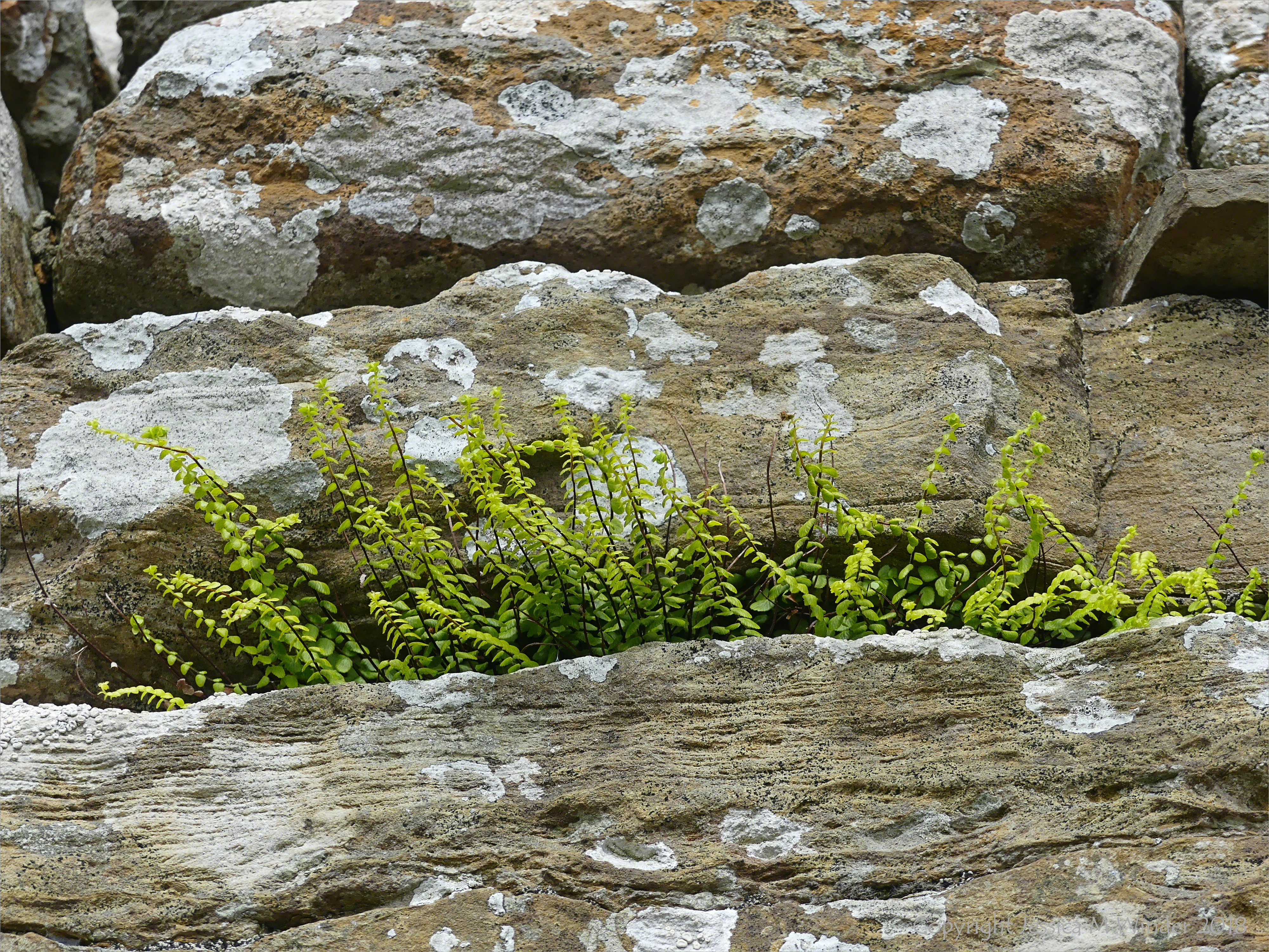 Stone Texture Broch of Gurness 22 – Natural patterns and textures of Devonian flagstone rocks (often covered with lichens or with ferns in the crevices) used as the building stonework for an ancient archaeological site on the north shore of Mainland Orkney.