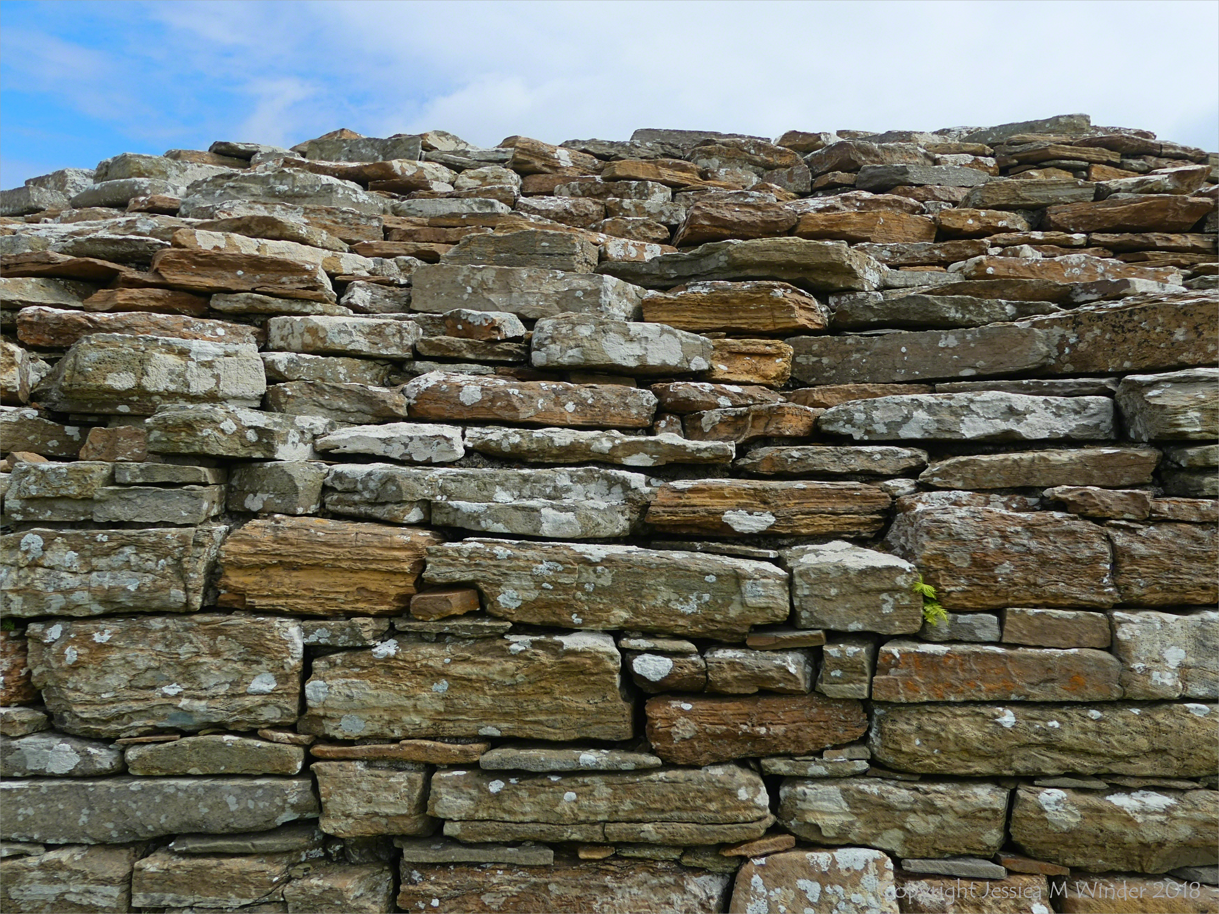 Stone Texture Broch of Gurness 27 – Natural patterns and textures of Devonian flagstone rocks (often covered with lichens or with ferns in the crevices) used as the building stonework for an ancient archaeological site on the north shore of Mainland Orkney.
