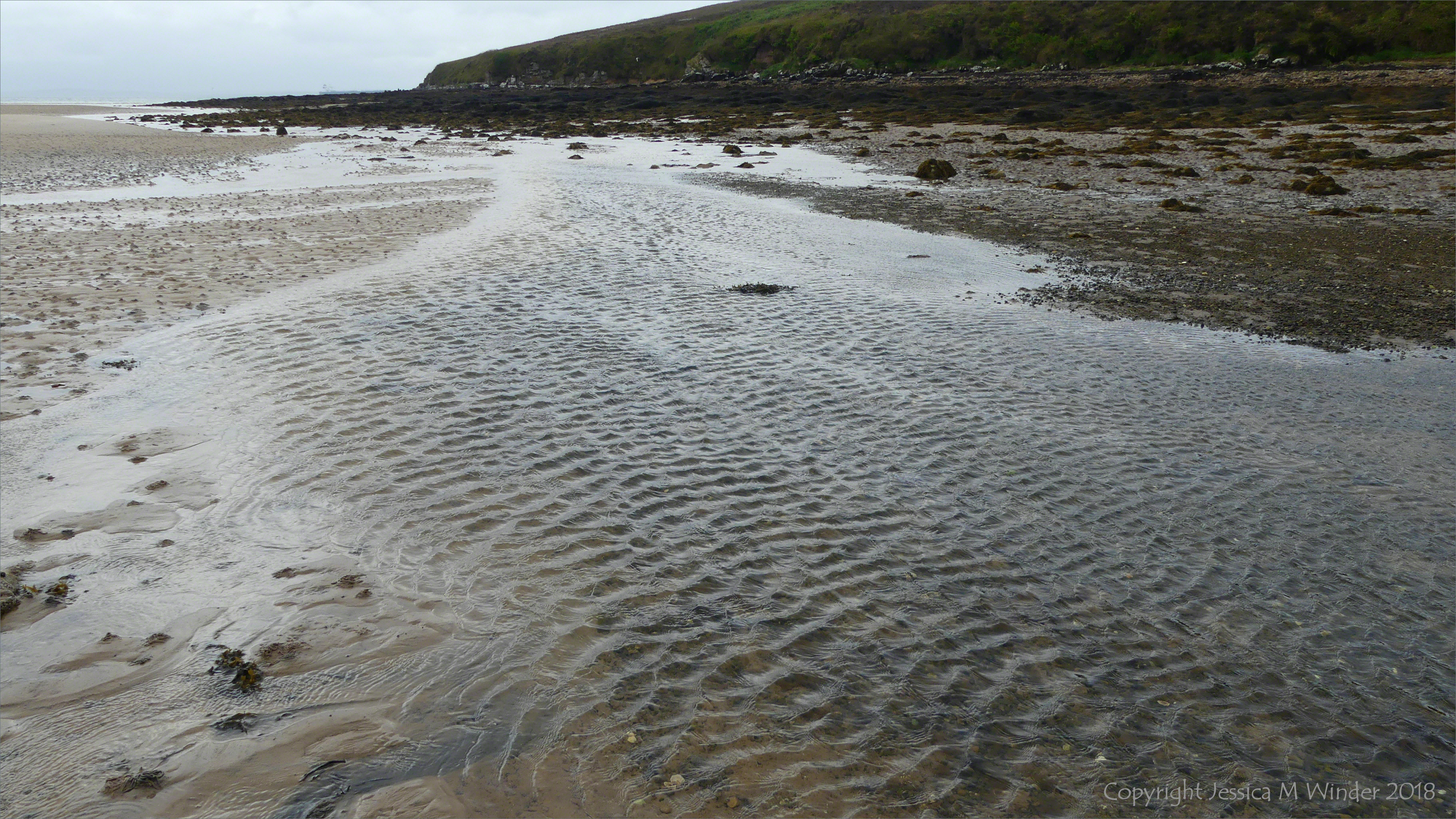 Water from Skaith at Waulkmill 1 – Context shot for the photographs of natural river surface water texture and patterns where water from Loch Kirbister and the Skaill crosses the sandy beach at Waulkmill Bay in Orkney