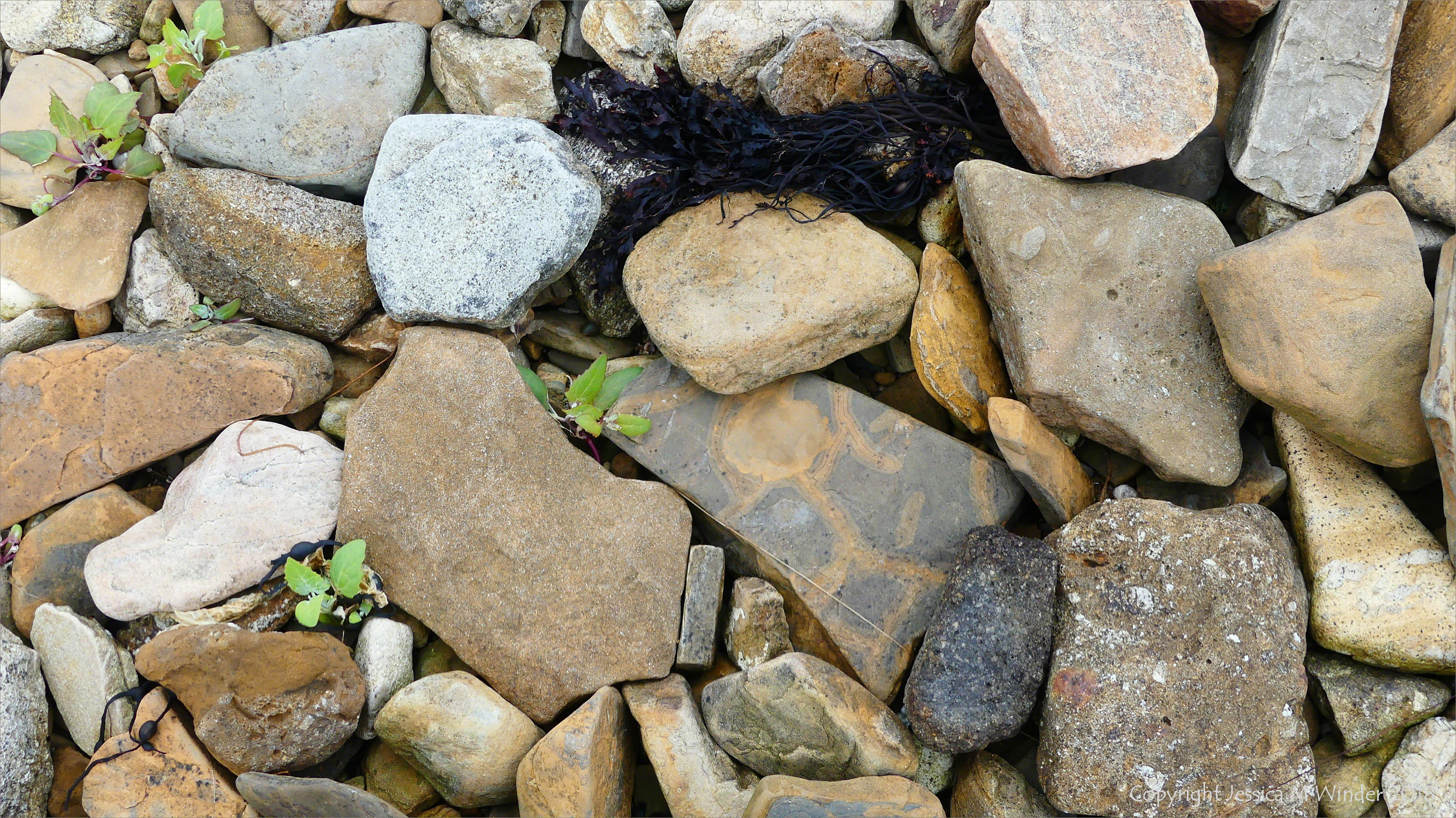 Beach Stones at Hamnavoe 5 – The local Lower Stromness Flagstone and other rocks lie on the eastern shore of the Hamnavoe inlet at Stromness in Orkney, as broken, flattened pieces which never really become rounded pebbles despite the pounding of the sea.