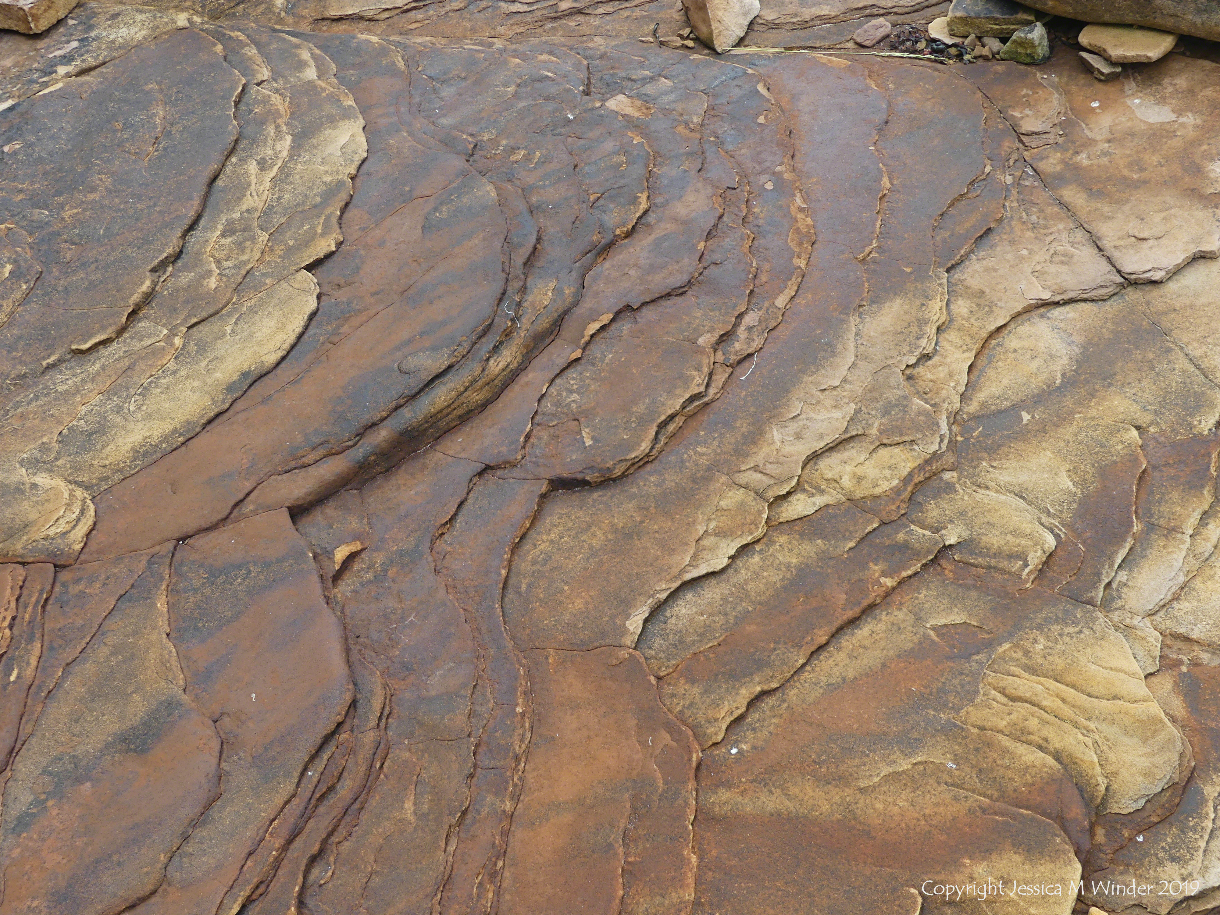 Rock Layers at Waulkmill Bay 7 – Water-worn sedimentary rock strata from the Eday Group of the Old Red Sandstone Supergroup on the north-east side of Waulkmill Bay on Mainland, Orkney, June 2018