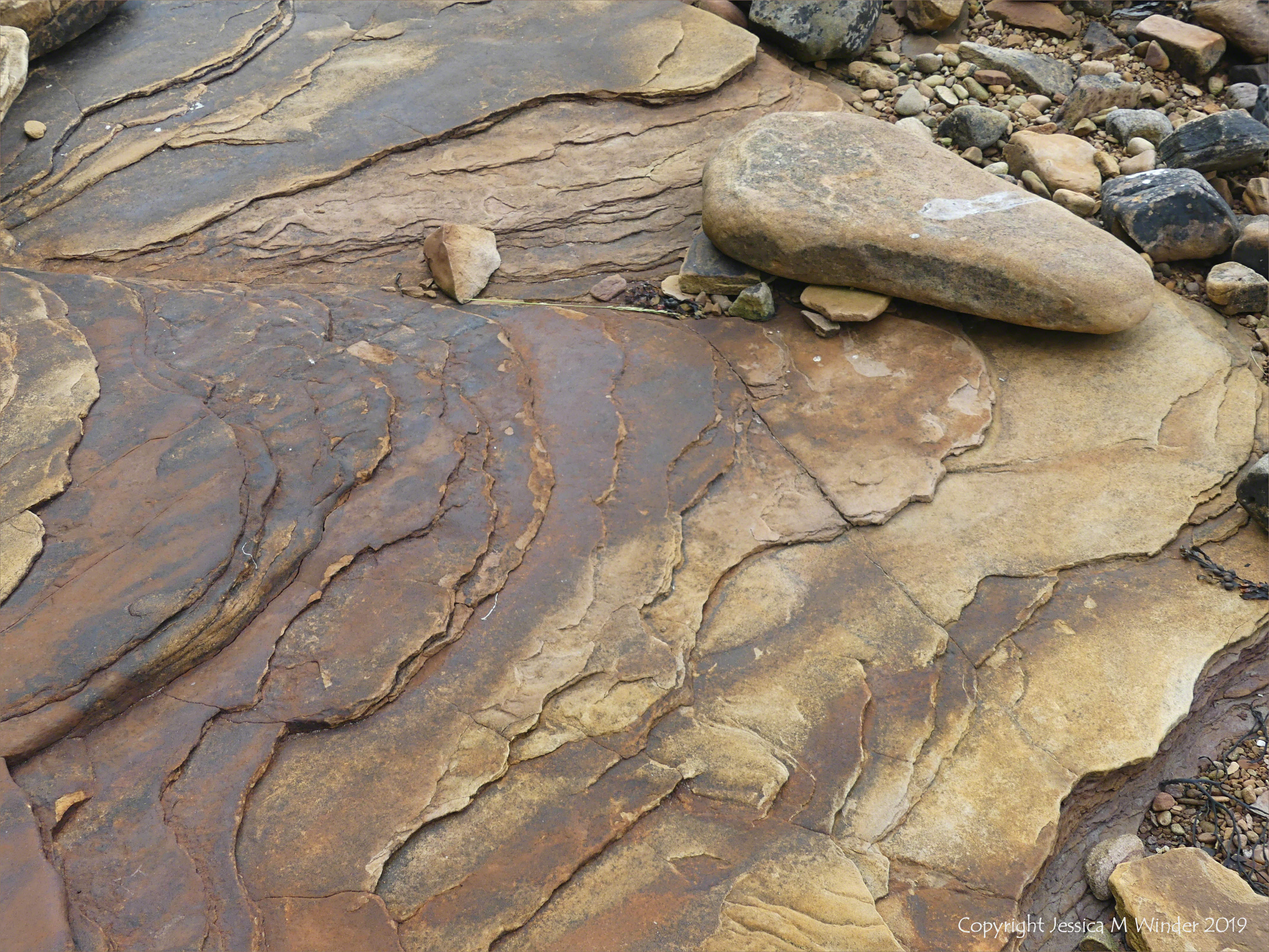Rock Layers at Waulkmill Bay 8 – Water-worn sedimentary rock strata from the Eday Group of the Old Red Sandstone Supergroup on the north-east side of Waulkmill Bay on Mainland, Orkney, June 2018