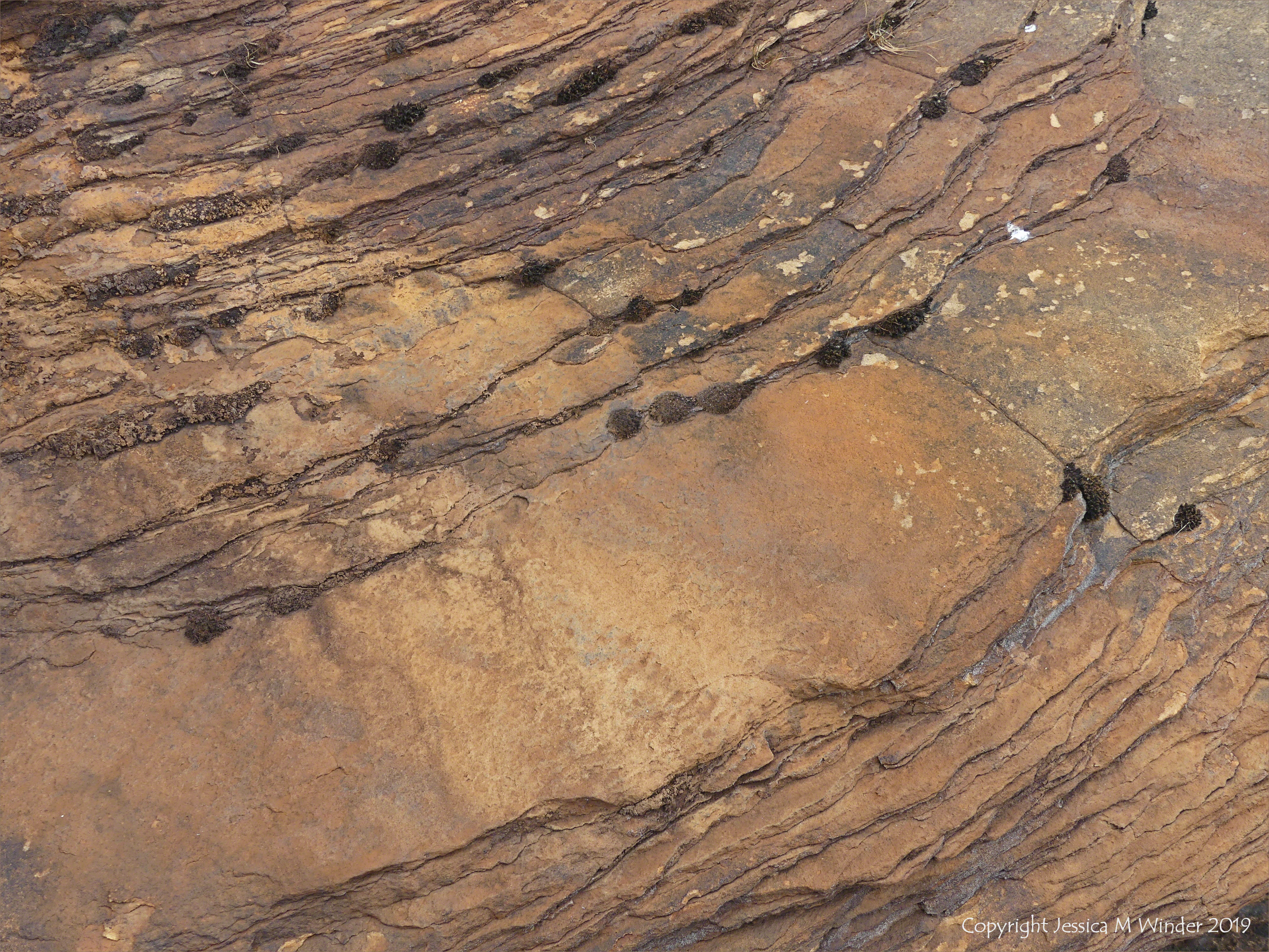 Rock Layers at Waulkmill Bay 9 – Water-worn sedimentary rock strata from the Eday Group of the Old Red Sandstone Supergroup on the north-east side of Waulkmill Bay on Mainland, Orkney, June 2018