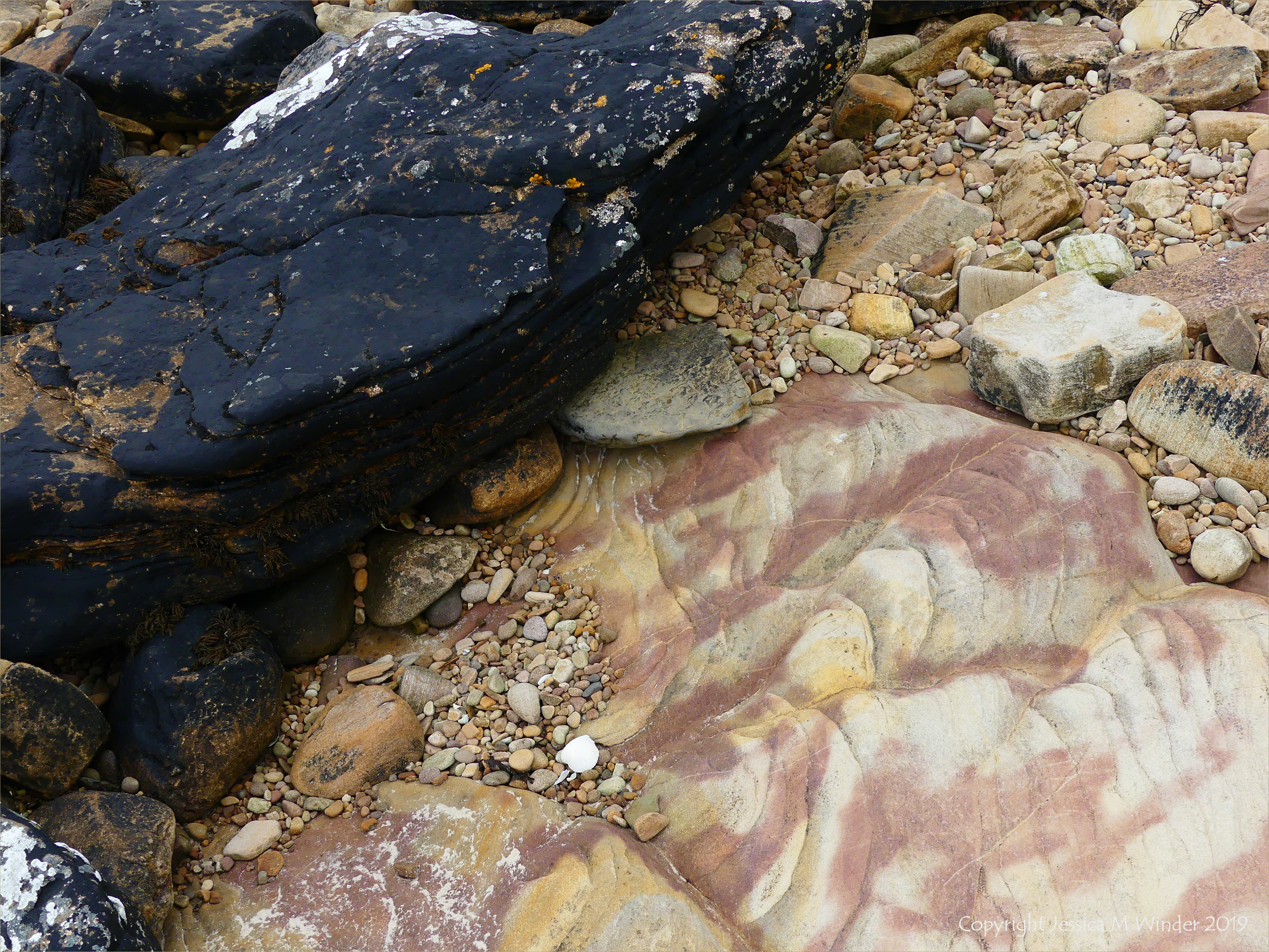 Rock Patterns at Waulkmill Bay 6 – Natural abstract patterns and textures in pink, yellow, and buff Eday Group sedimentary rock (possibly Lower Eday Sandstone Formation) on Orkney Mainland at Waulkmill Bay.