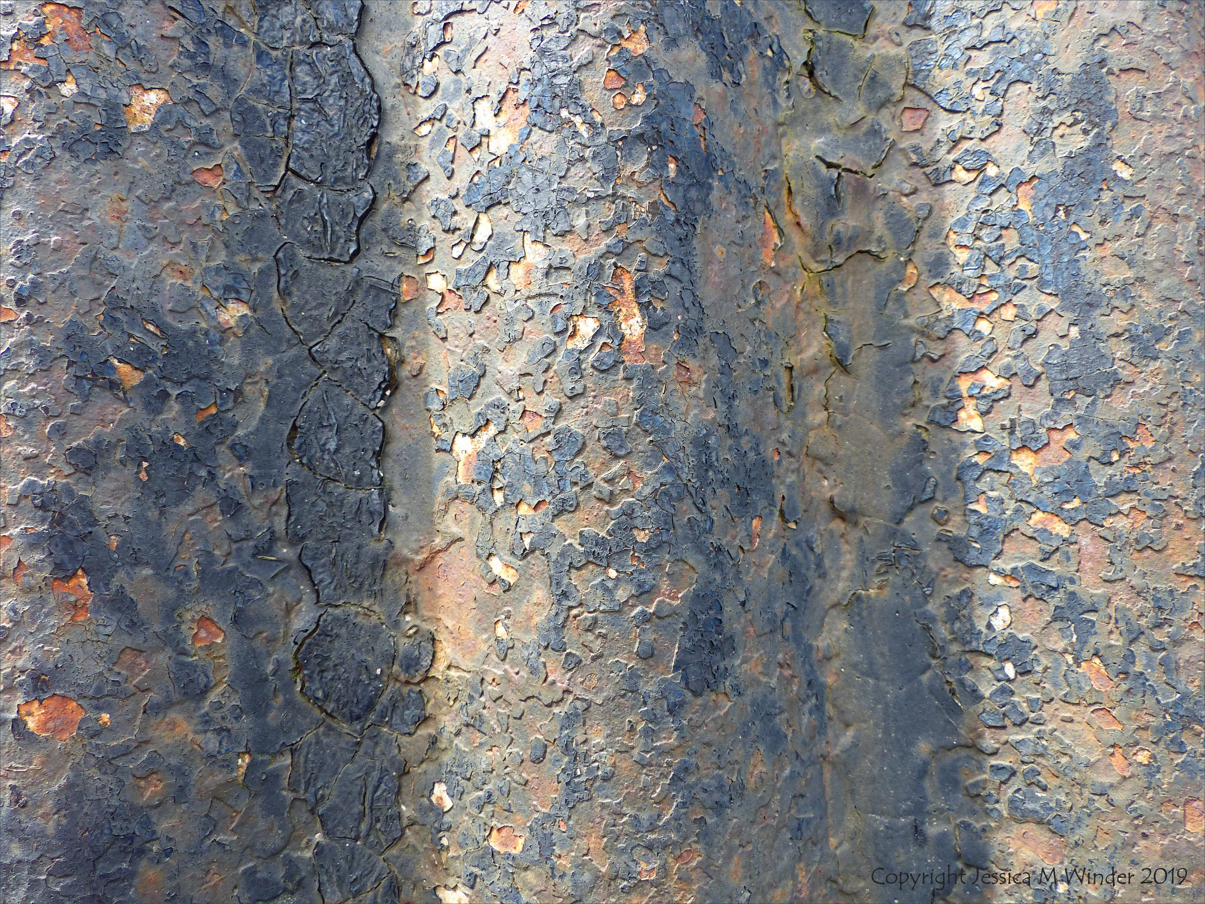 Weathering KB6 – The textural effects of natural weathering by elemental processes on bitumen-painted corrugated iron used in the construction of old boathouses on the coast.