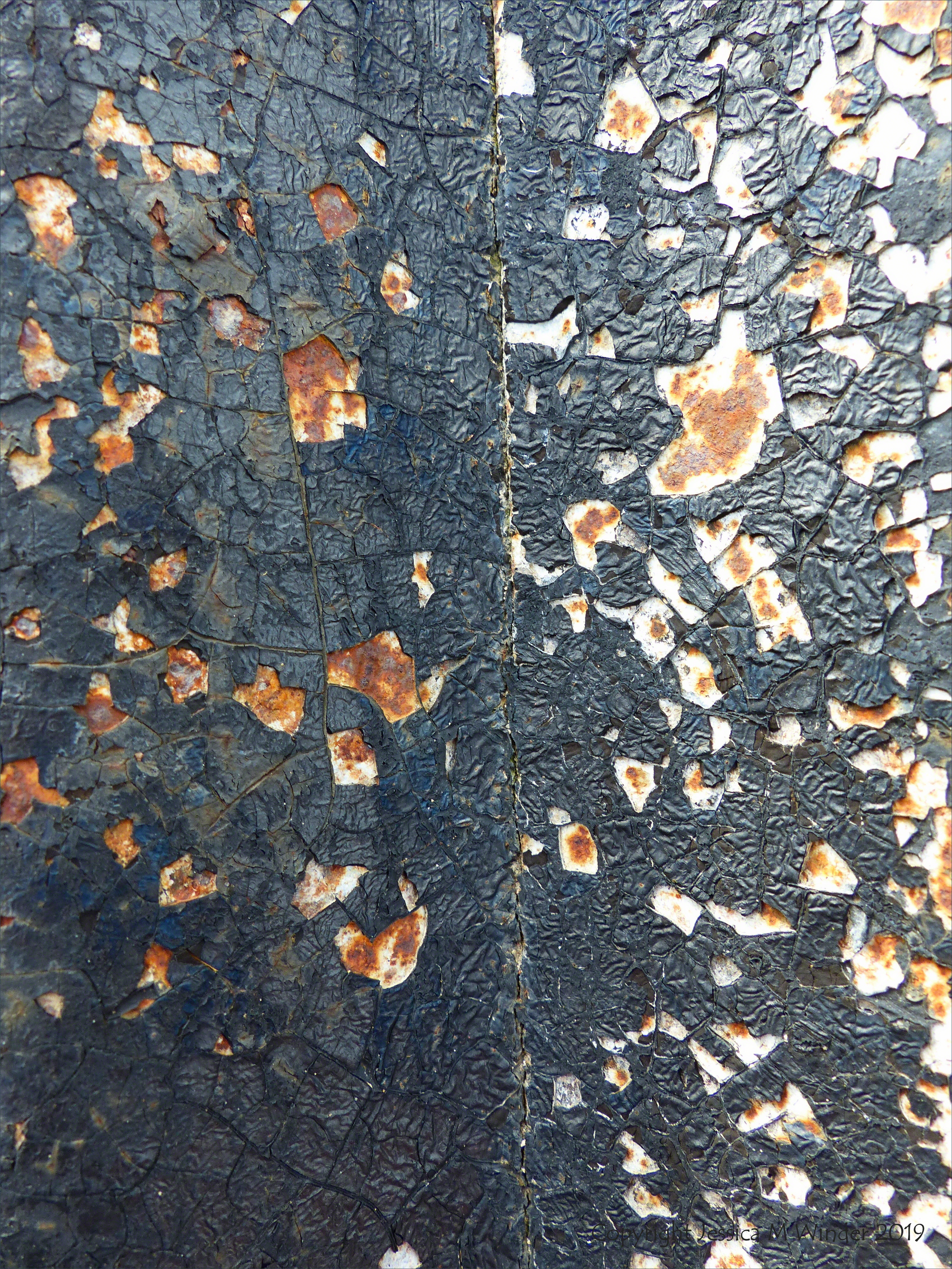 Weathering KB9 – The textural effects of natural weathering by elemental processes on bitumen-painted corrugated iron used in the construction of old boathouses on the coast.