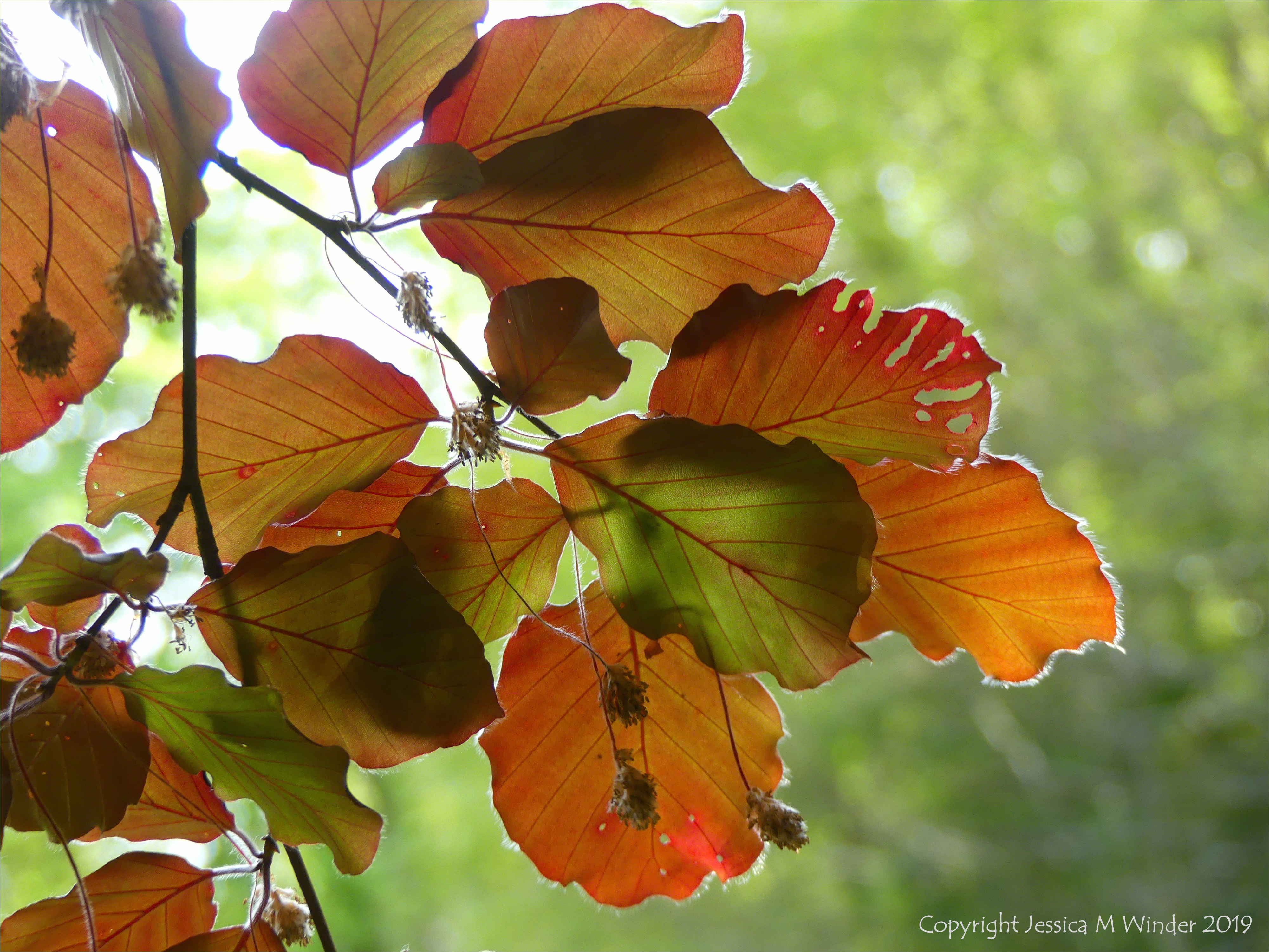Beech Leaves 5 – The effect of sun light shining through the newly opened leaves on a copper beech tree in spring. The luminosity of leaves in sunlight.