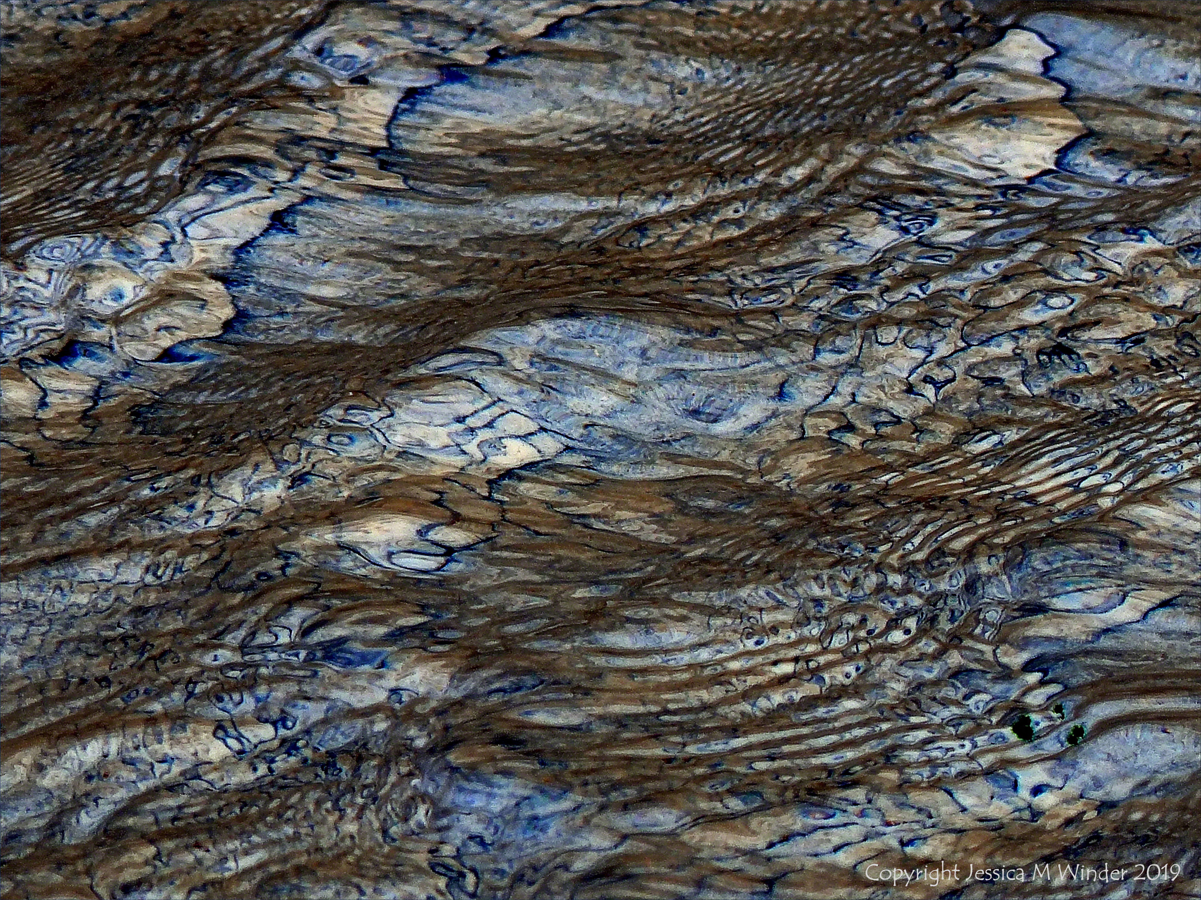 Water Study 3 – One of a long series of digitally re-coloured photographs of the ever-changing patterns of reflected light on shallow ripples at the water’s edge on the beach at Rhossili Bay in Gower, South Wales.