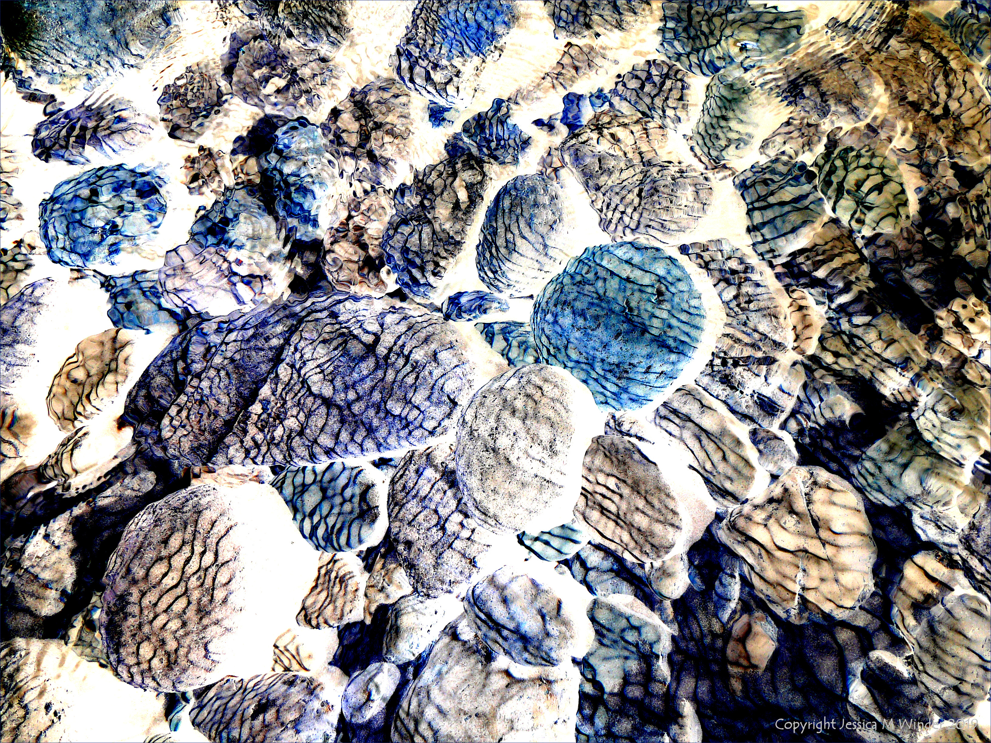Digitally altered photograph of natural patterns of reflected light on river-bed pebbles at Neptune State Park in Oregon on the North West Pacific Coast September 2010.