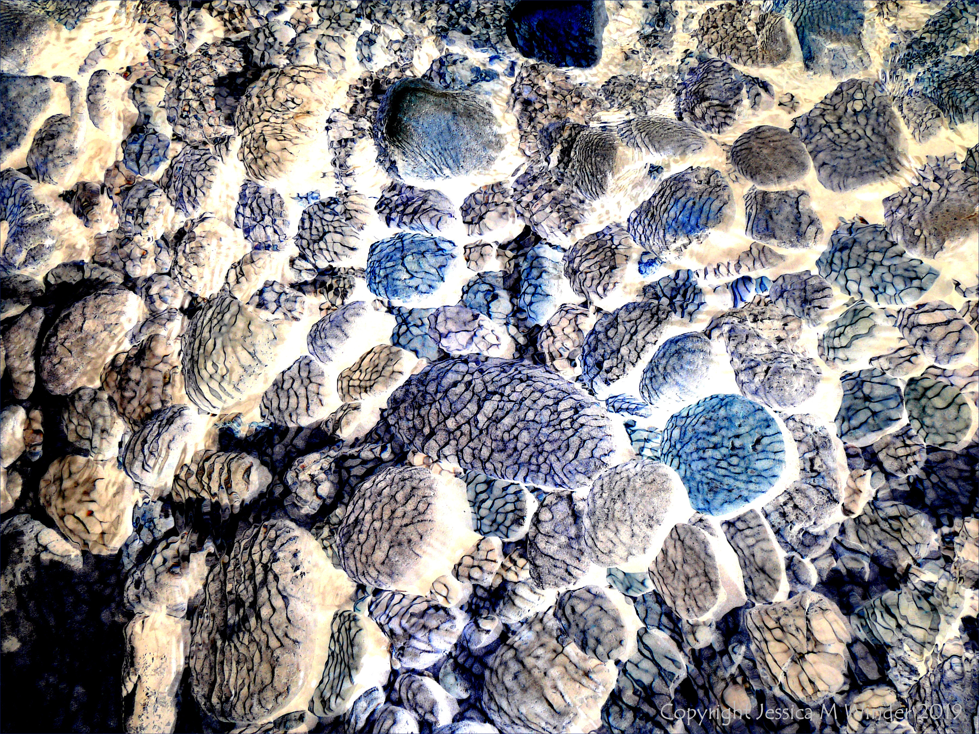Digitally altered photograph of natural patterns of reflected light on river-bed pebbles at Neptune State Park in Oregon on the North West Pacific Coast September 2010.