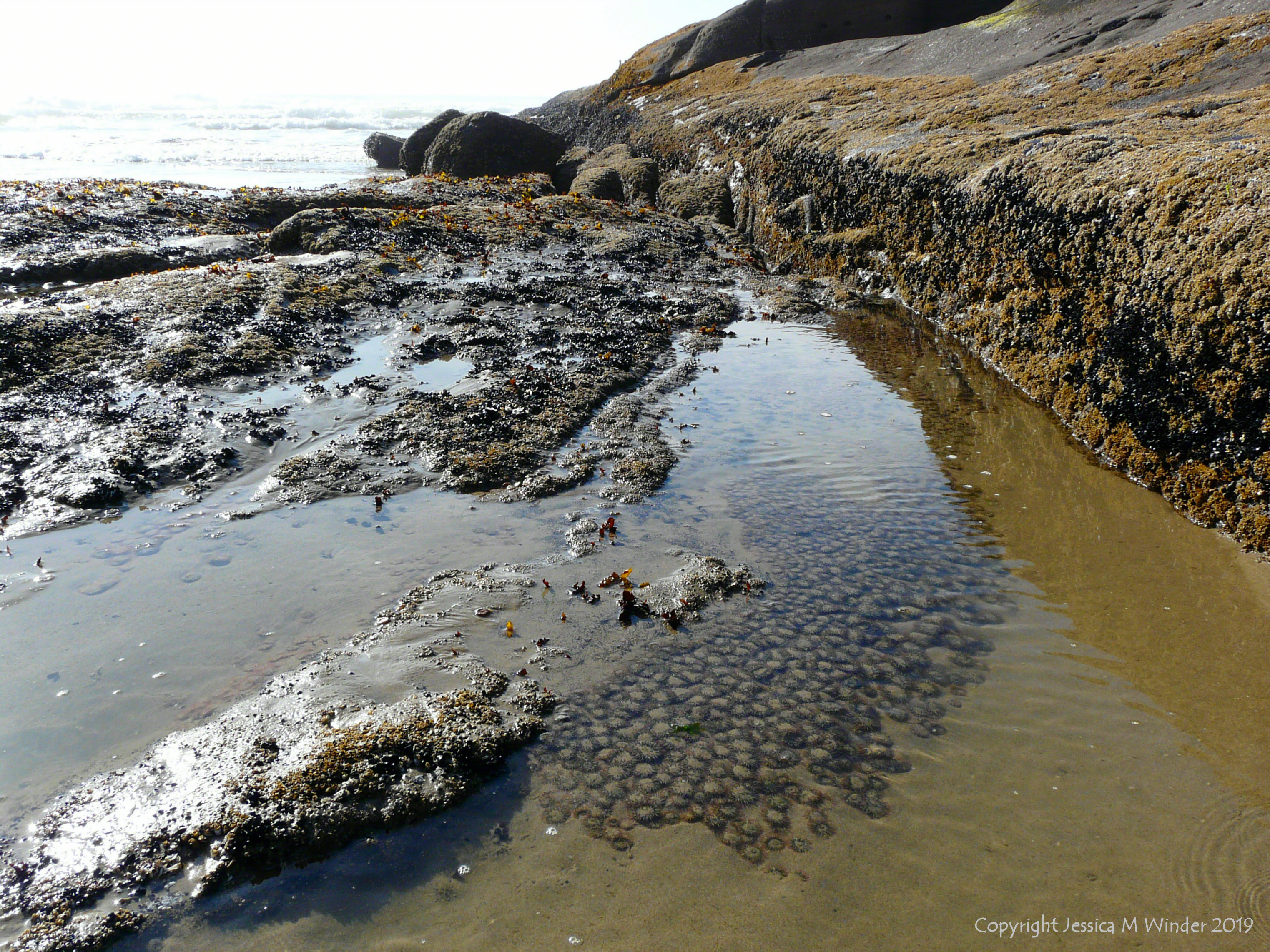 Surf or Aggregating Anemones (Anthopleura elegantissima) on the beach near Yachats in the North West Pacific coast in Oregon. A colony of cloned individuals that attach to rocks but love a sandy environment.