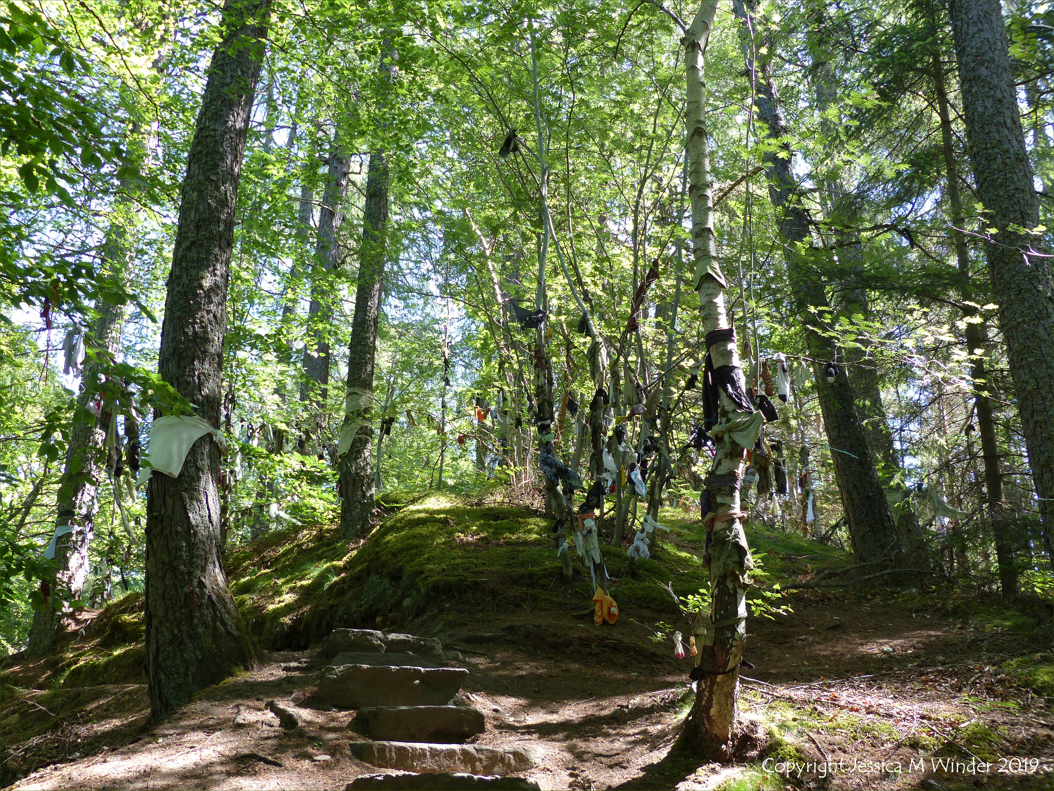 Rags, clothing, and other objects tied to trees around a sacred spring at the Clootie Well near Munlochy on the Black Isle, north of Inverness in Scotland, June 2018.