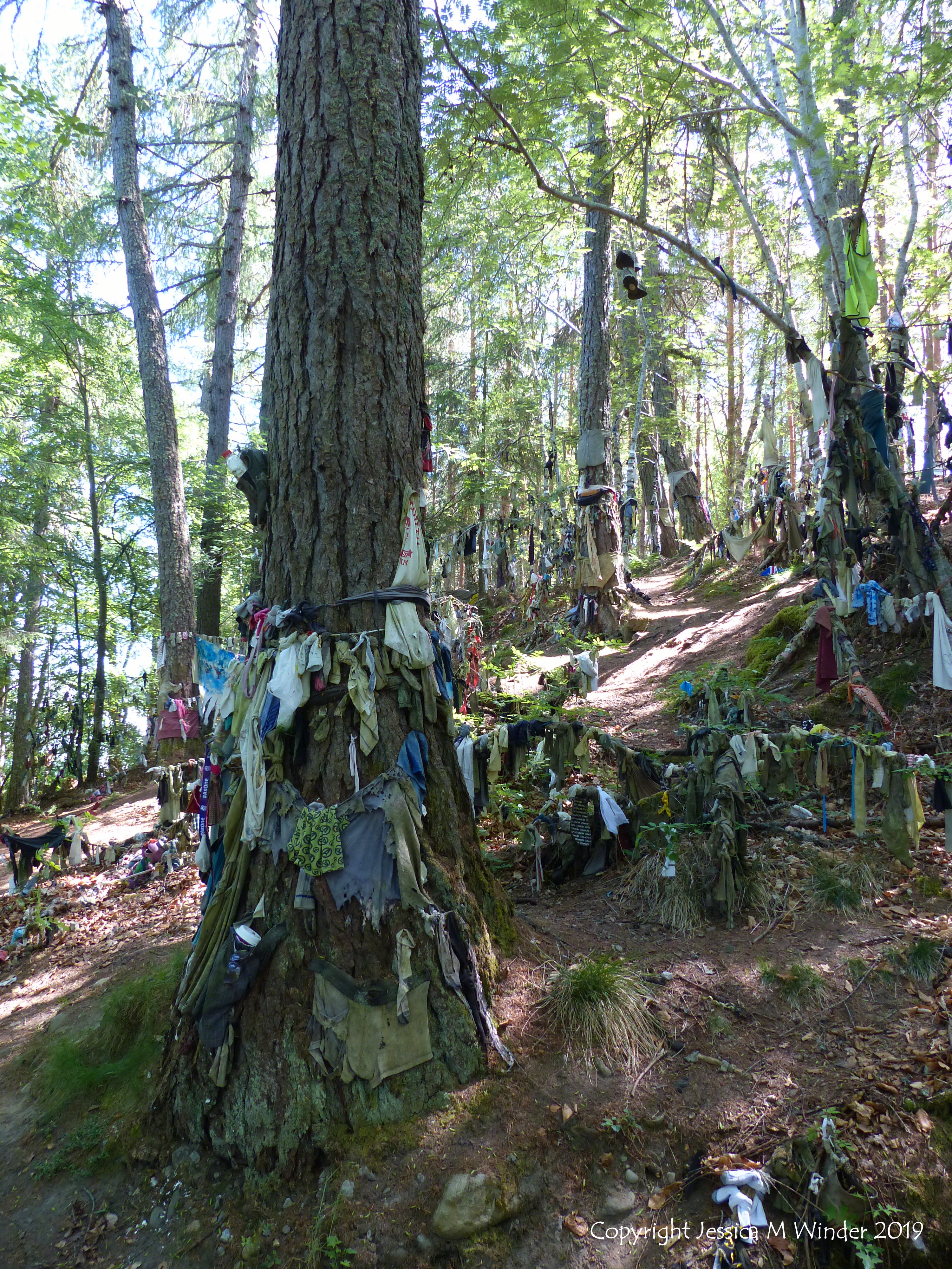 Rags, clothing, and other objects tied to trees around a sacred spring at the Clootie Well near Munlochy on the Black Isle, north of Inverness in Scotland, June 2018.