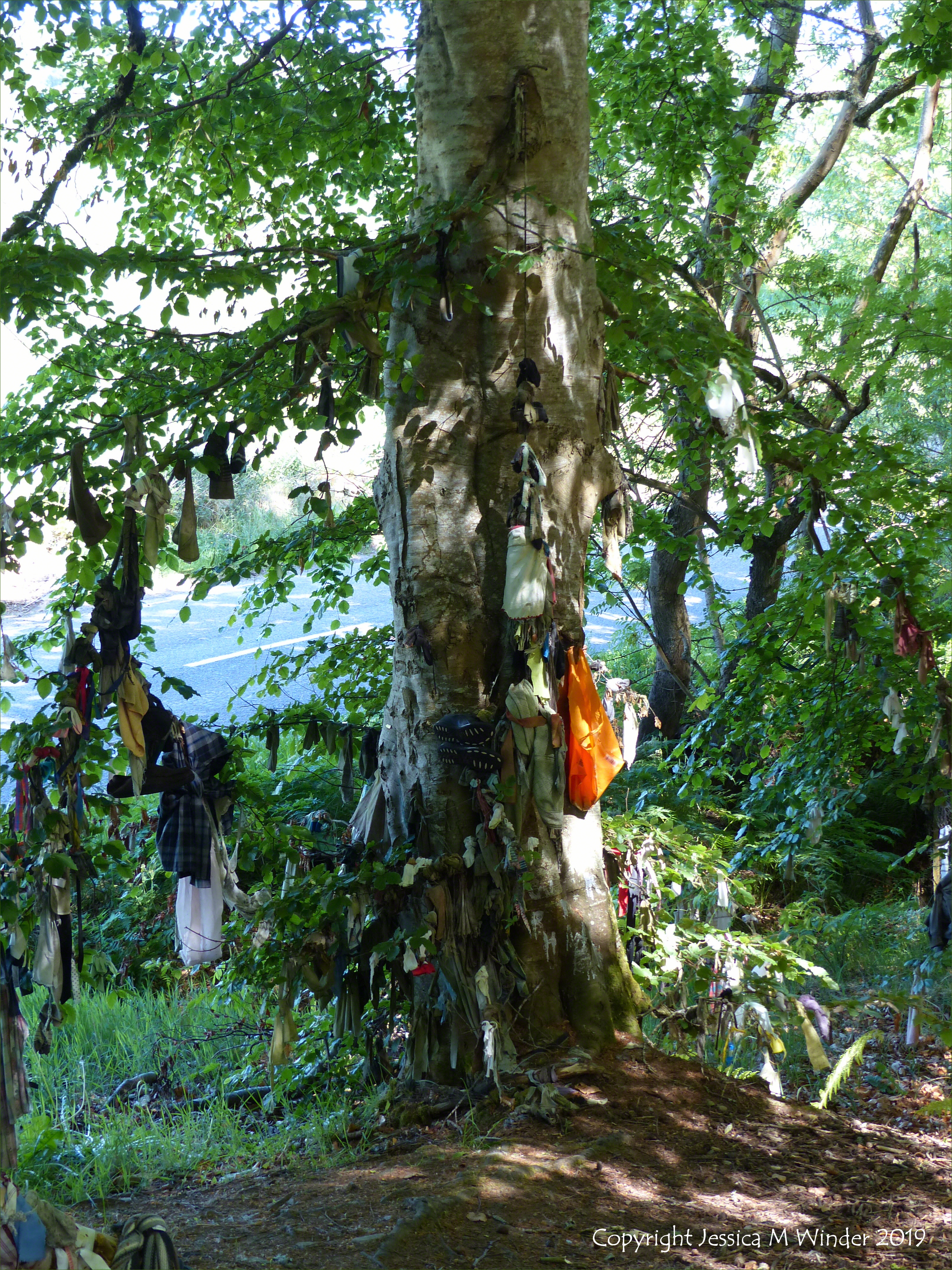 Rags, clothing, and other objects tied to trees around a sacred spring at the Clootie Well near Munlochy on the Black Isle, north of Inverness in Scotland, June 2018.