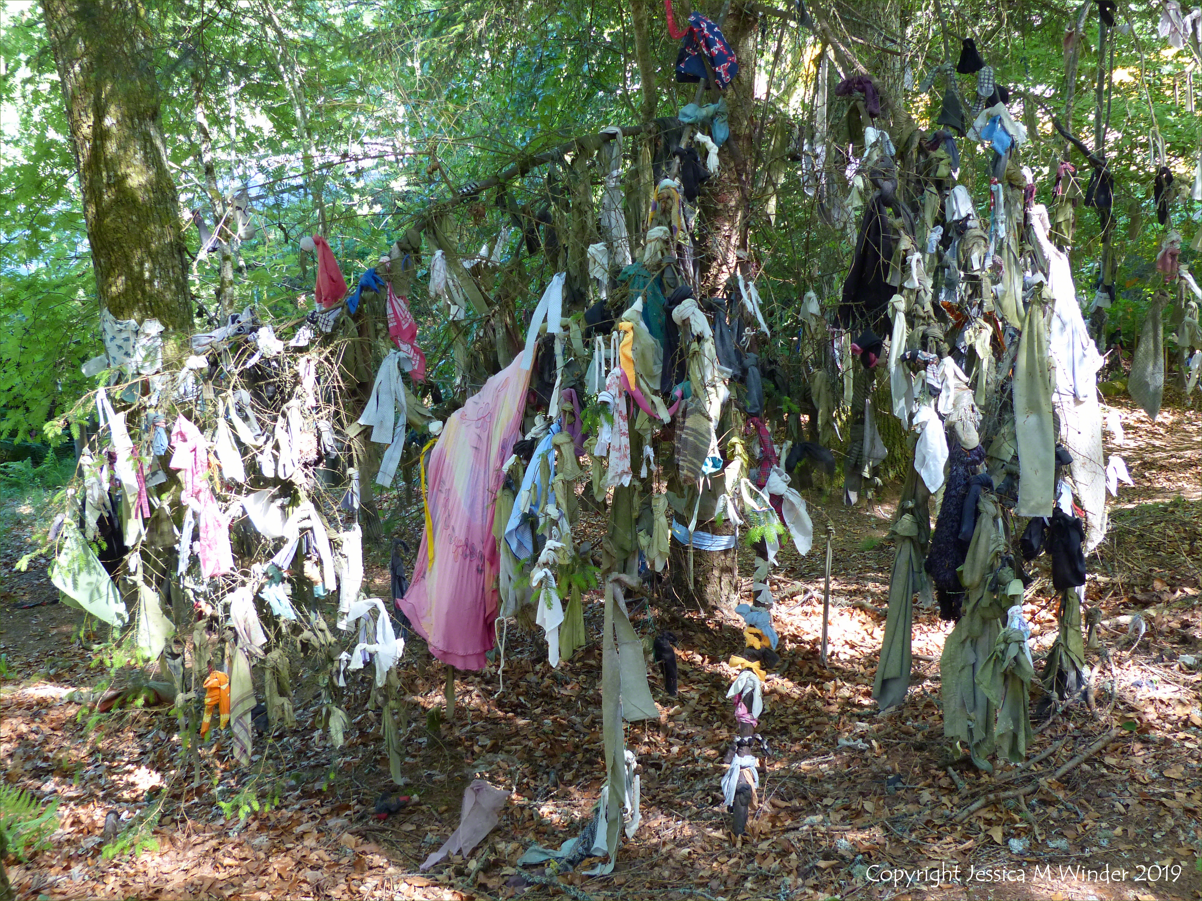 Rags, clothing, and other objects tied to trees around a sacred spring at the Clootie Well near Munlochy on the Black Isle, north of Inverness in Scotland, June 2018.