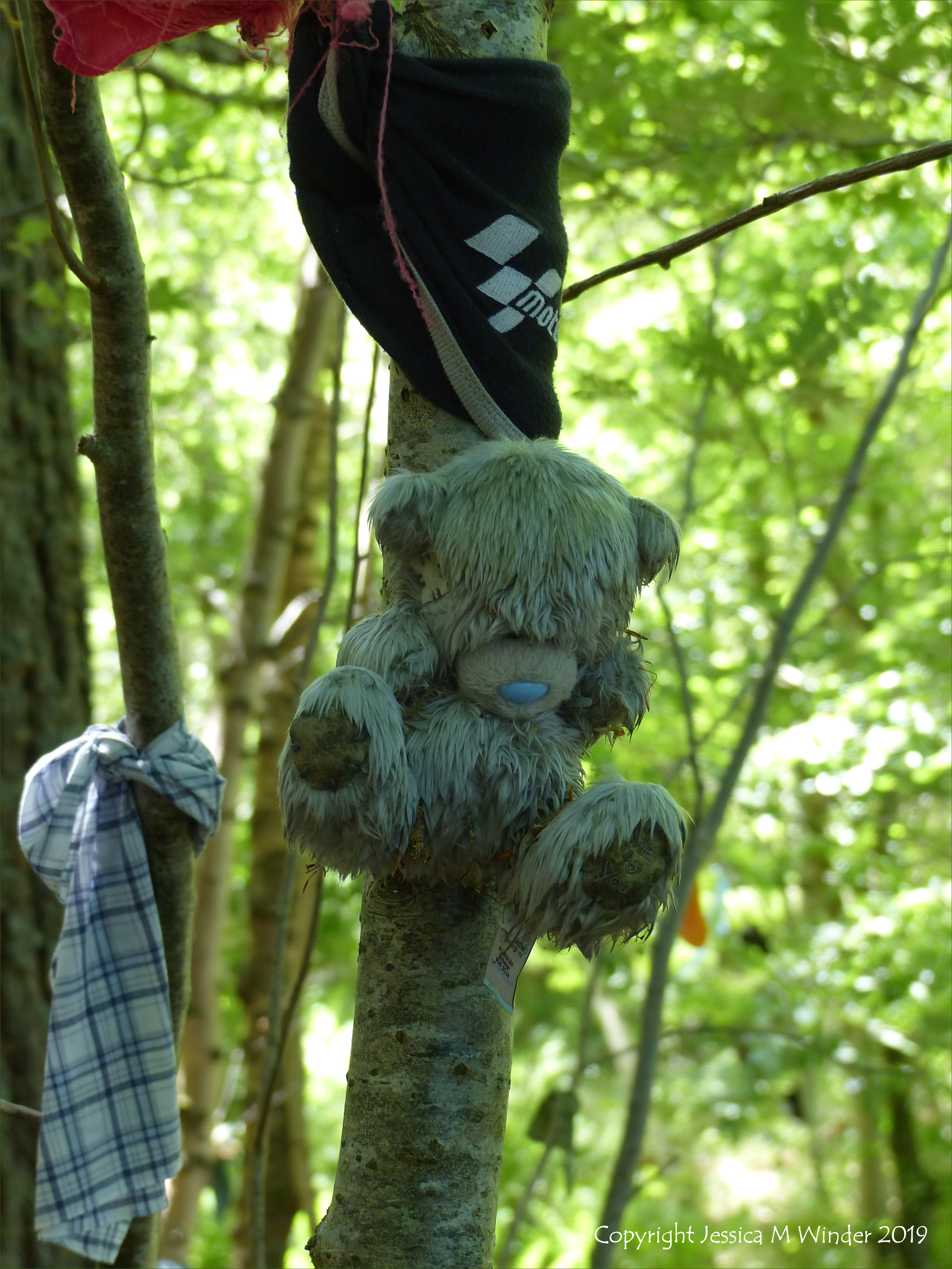 Rags, clothing, and other objects tied to trees around a sacred spring at the Clootie Well near Munlochy on the Black Isle, north of Inverness in Scotland, June 2018.