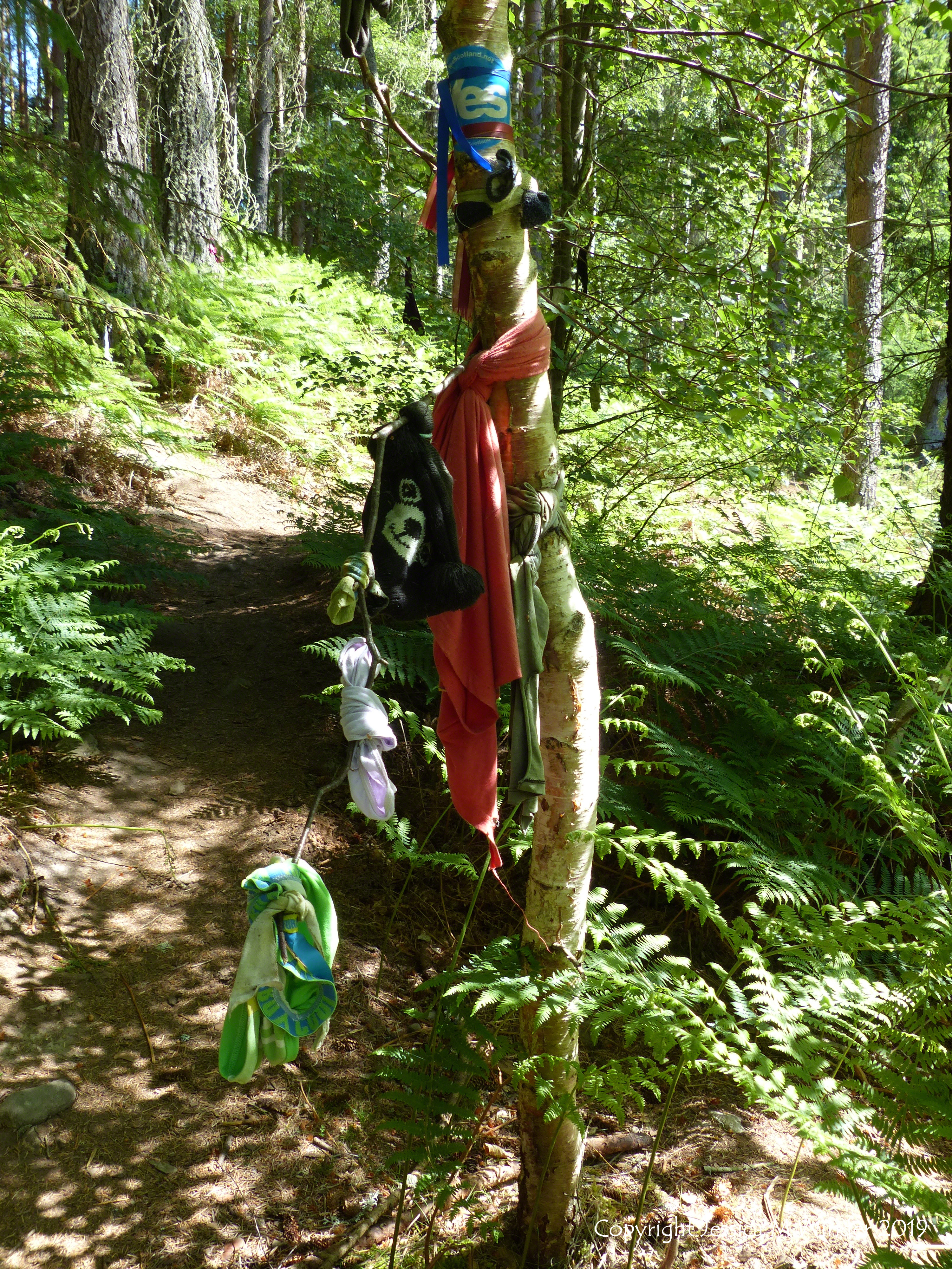 Rags, clothing, and other objects tied to trees around a sacred spring at the Clootie Well near Munlochy on the Black Isle, north of Inverness in Scotland, June 2018.