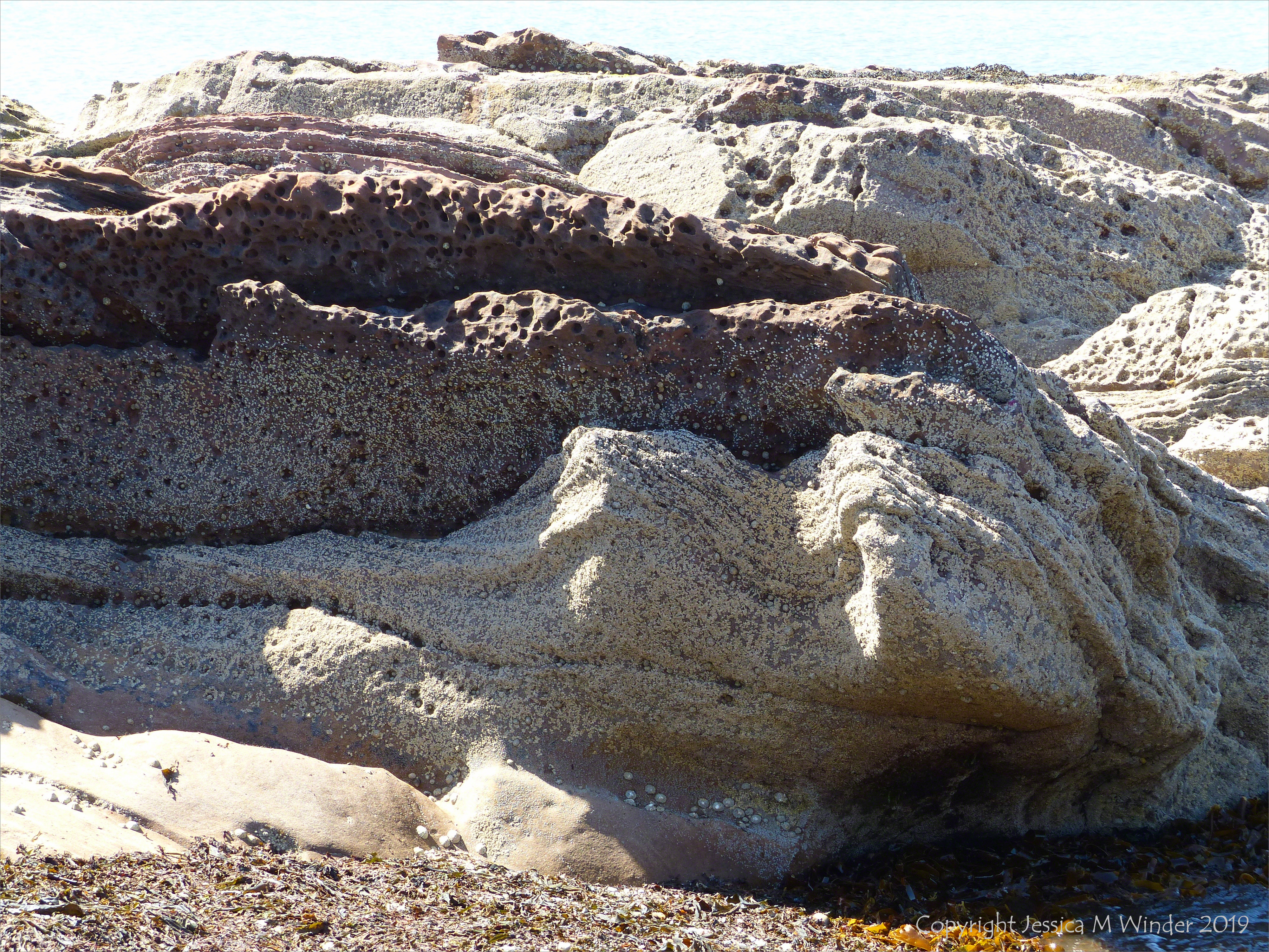 Natural paattern and texture in Upper Old Red Devonian Sandstone at Portmahomack on the east coast of Scotland – the Balnagown Group lying above the Strath Rory Group, June 2018