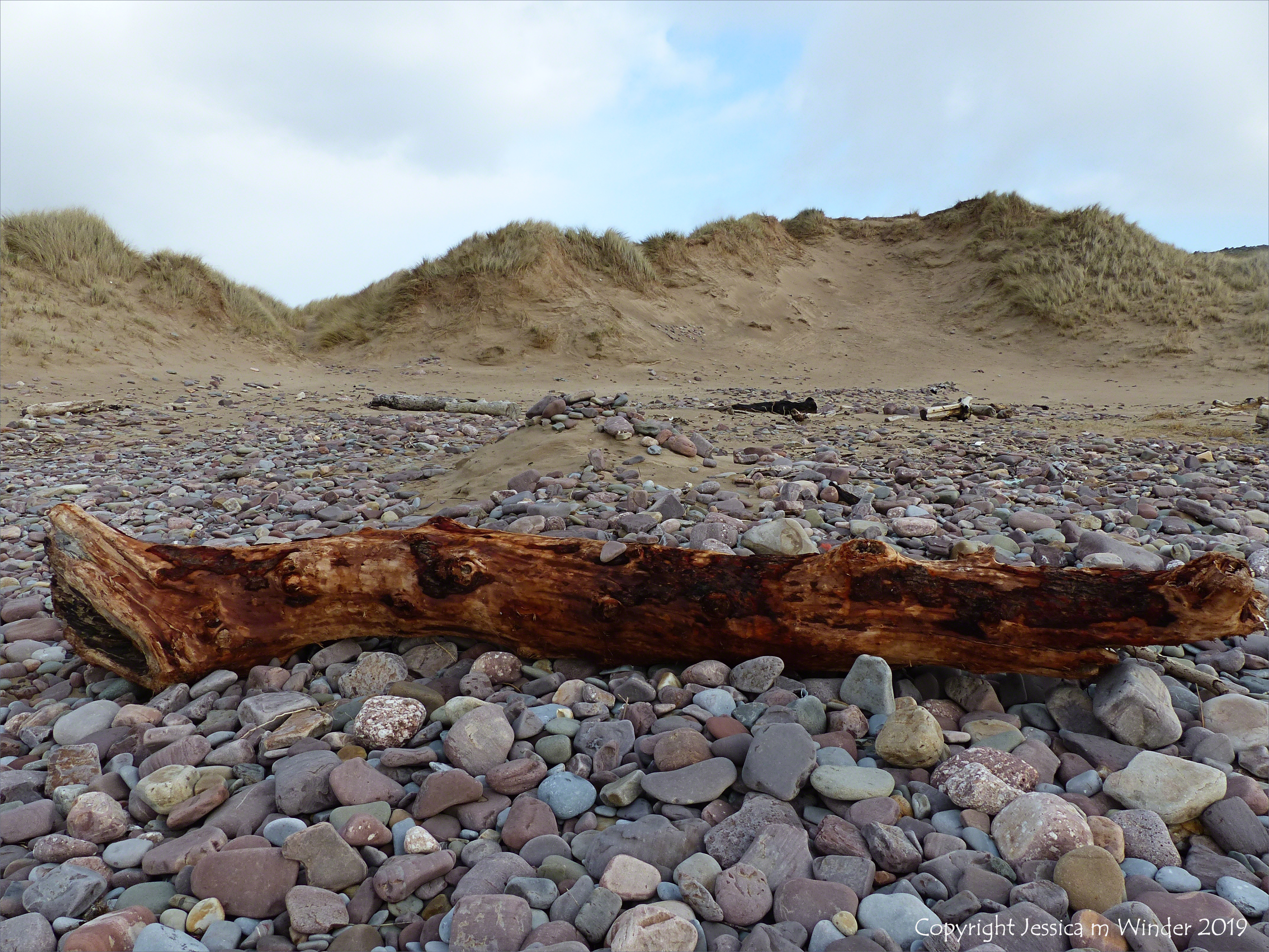 Driftwood tree trunk on the pebbles at Rhossili Bay, Gower, February 2018