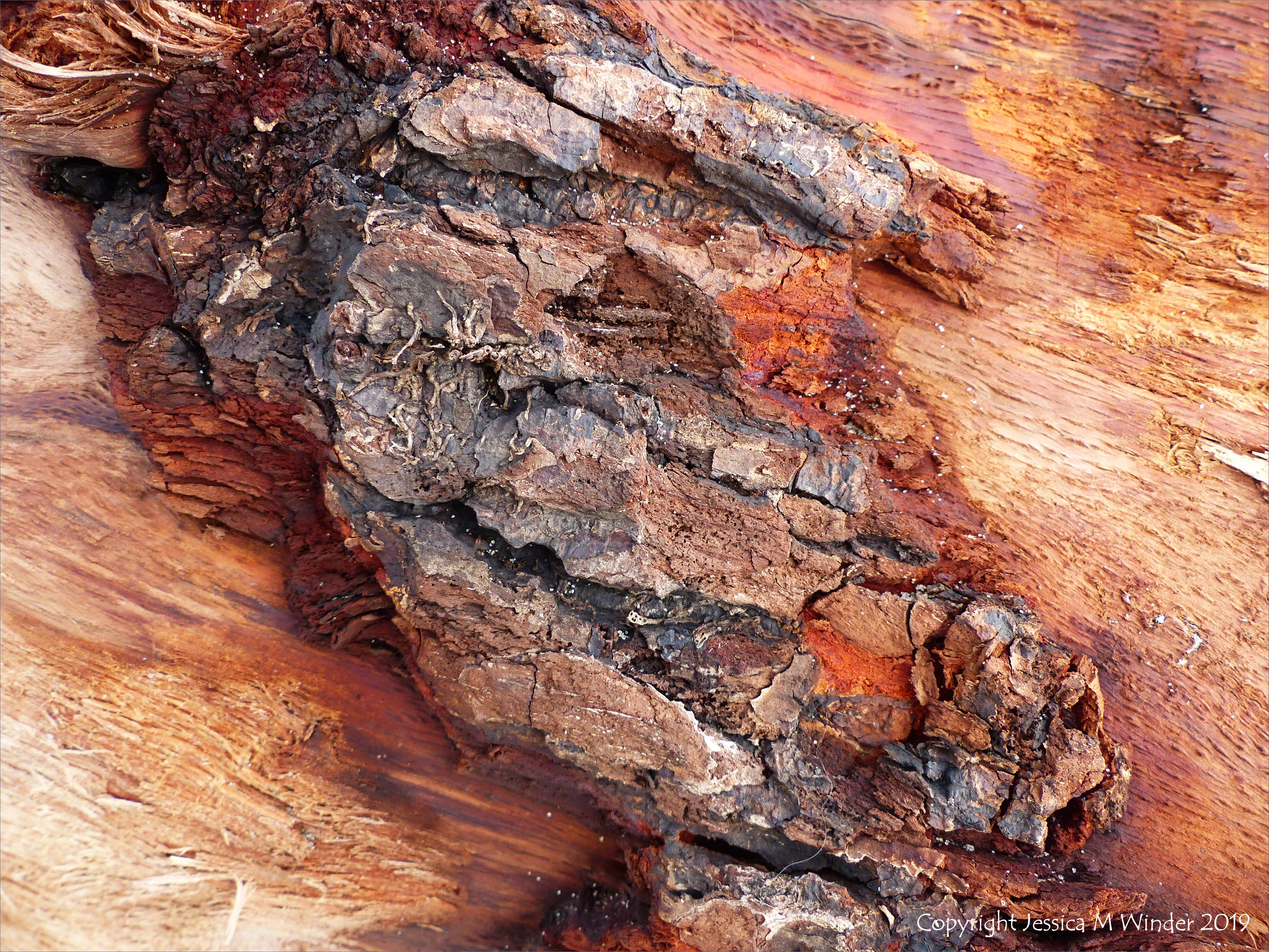 Close-up of colour and texture in remnants of bark on a waterlogged tree trunk washed up at Rhossili Bay, Gower, February 2018