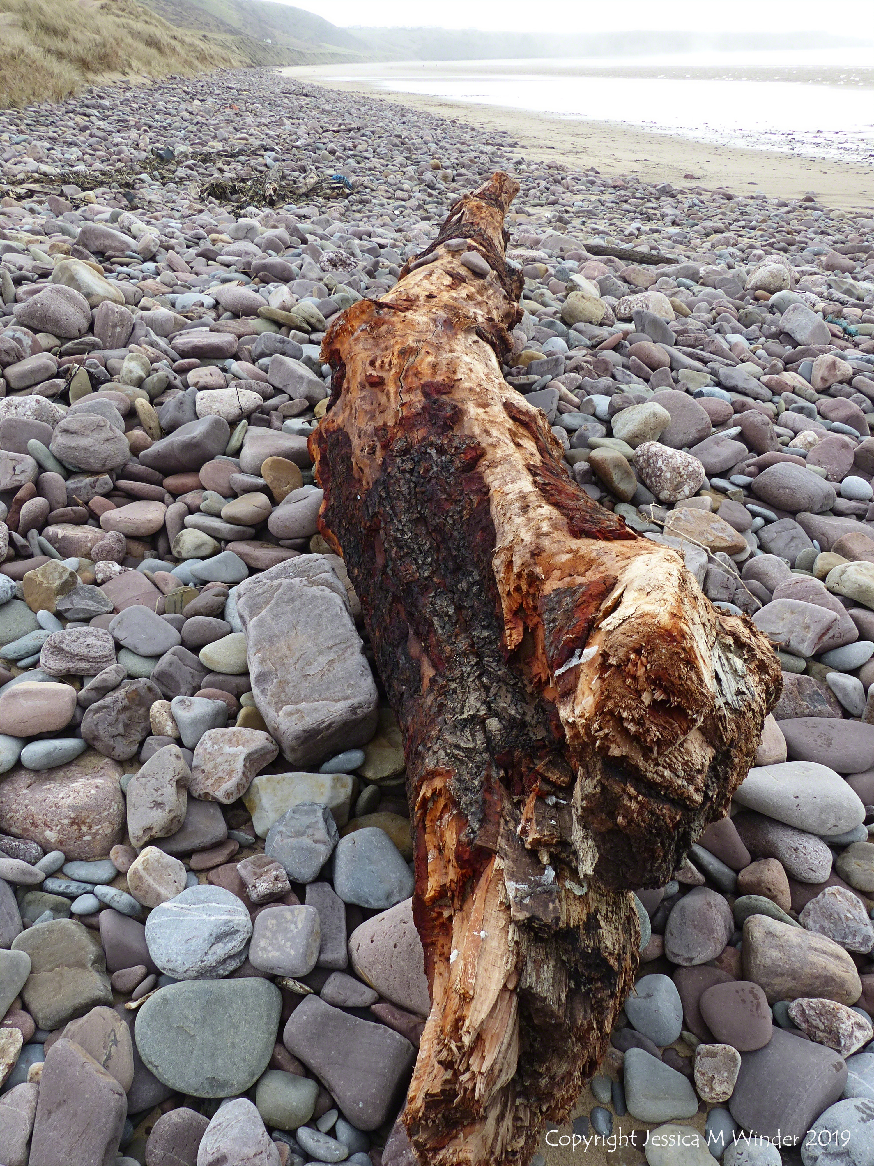 Driftwood tree trunk on the pebbles at Rhossili Bay, Gower, February 2018
