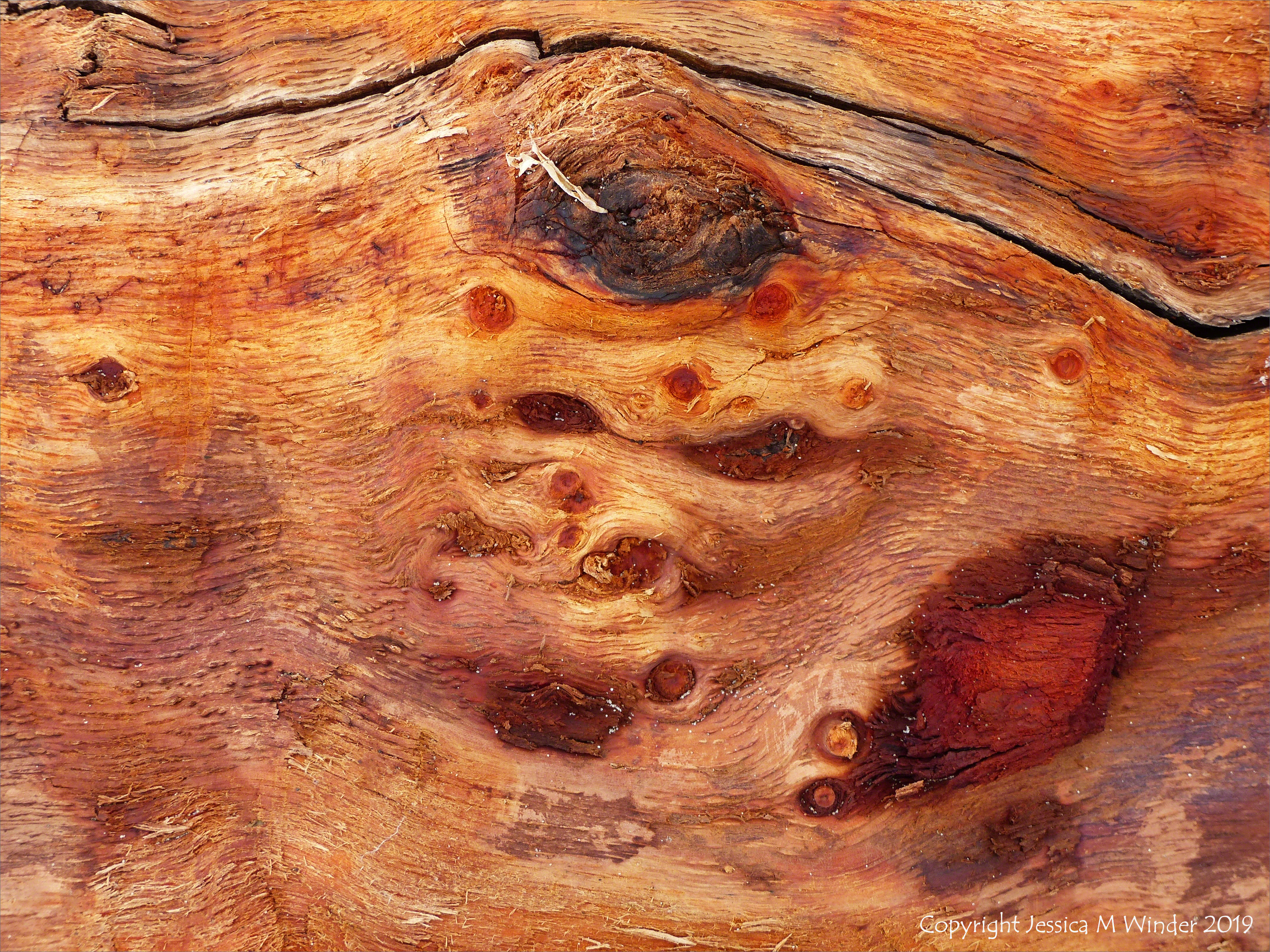 Close-up of colour and texture in remnants of bark on a waterlogged tree trunk washed up at Rhossili Bay, Gower, February 2018