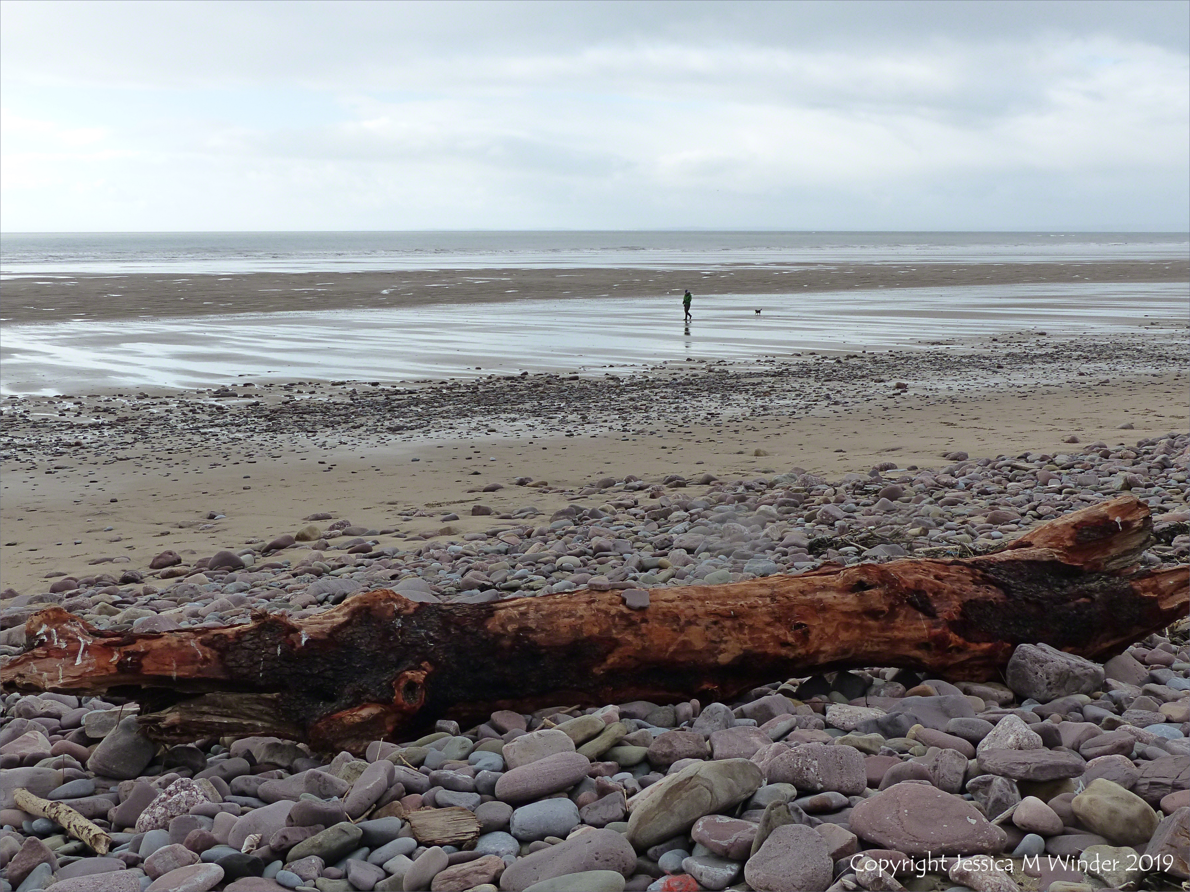 Driftwood tree trunk on the pebbles at Rhossili Bay, Gower, February 2018