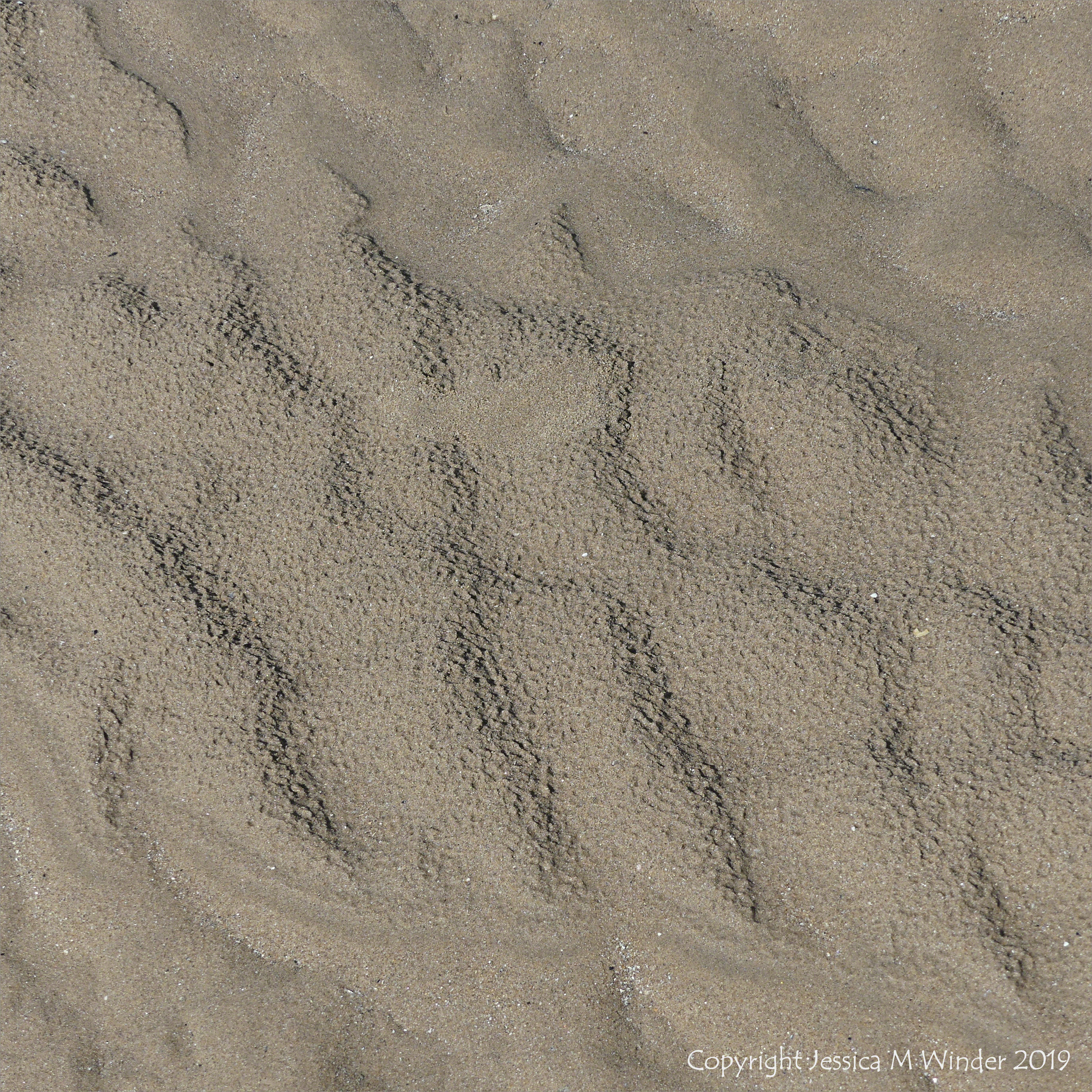 Natural patterns of ripples and texture in wet sand left by the ebbing tide near Burry Holms, Rhossili Bay, August 2019