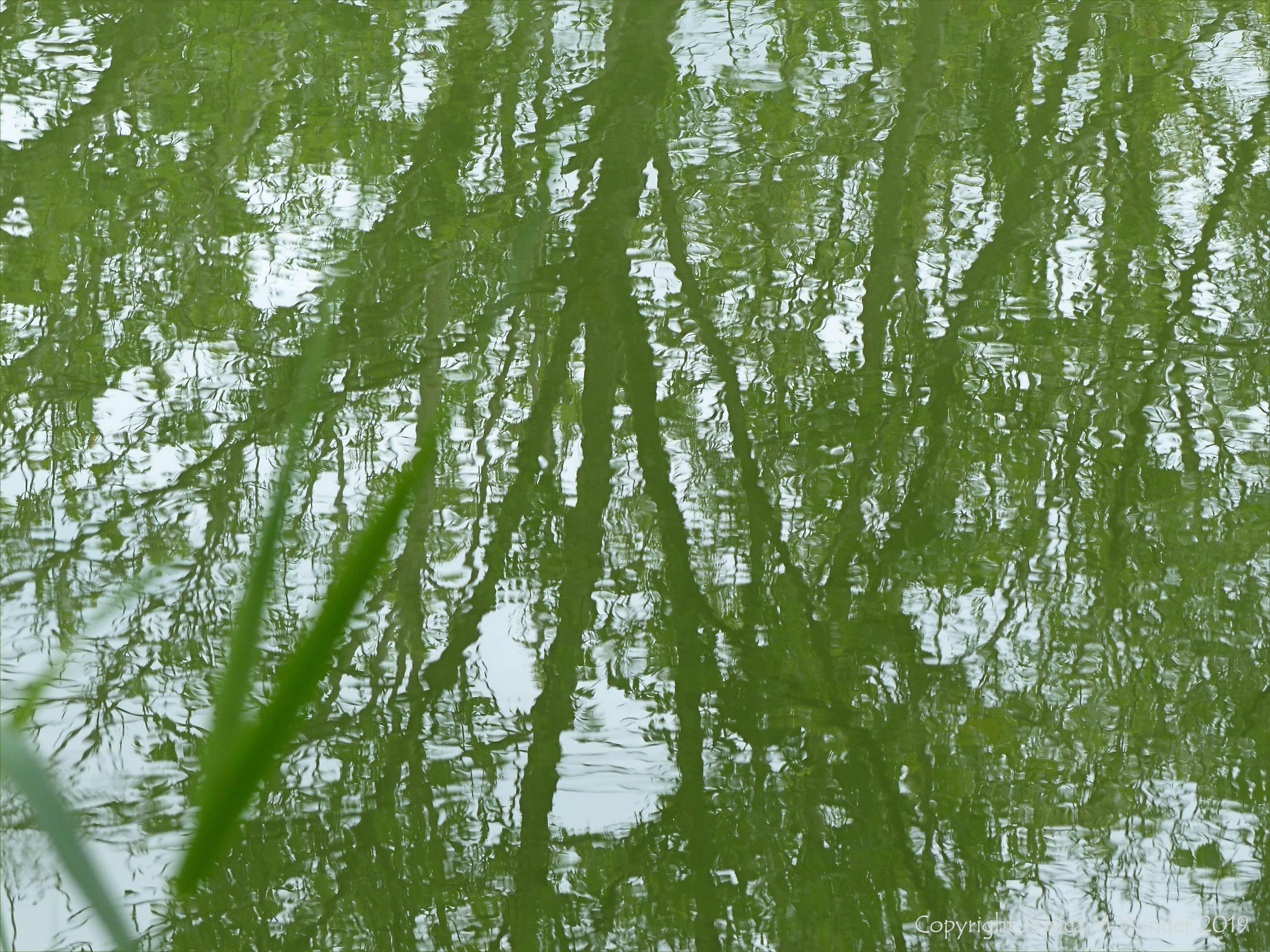 Leaves and trees reflected in the water at Sculpture by the Lakes (Pallington) near Tincleton, Dorset, 18.07.2019.