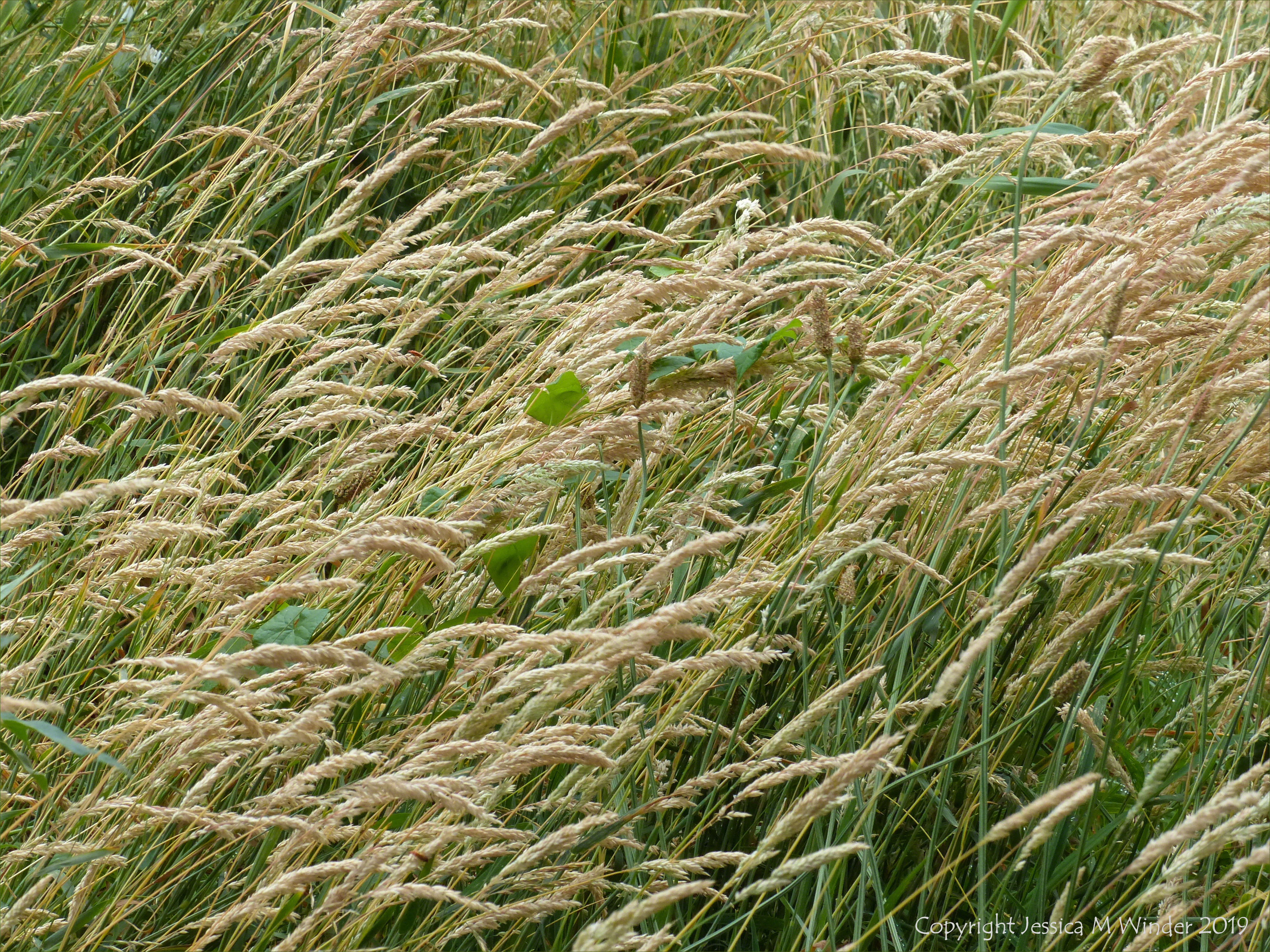 Pallington Lakes 6 SBTL07.19 Wild grasses as lakeside vegetation at “Sculpture by the Lakes” near Tincleton in Dorset July 2019
