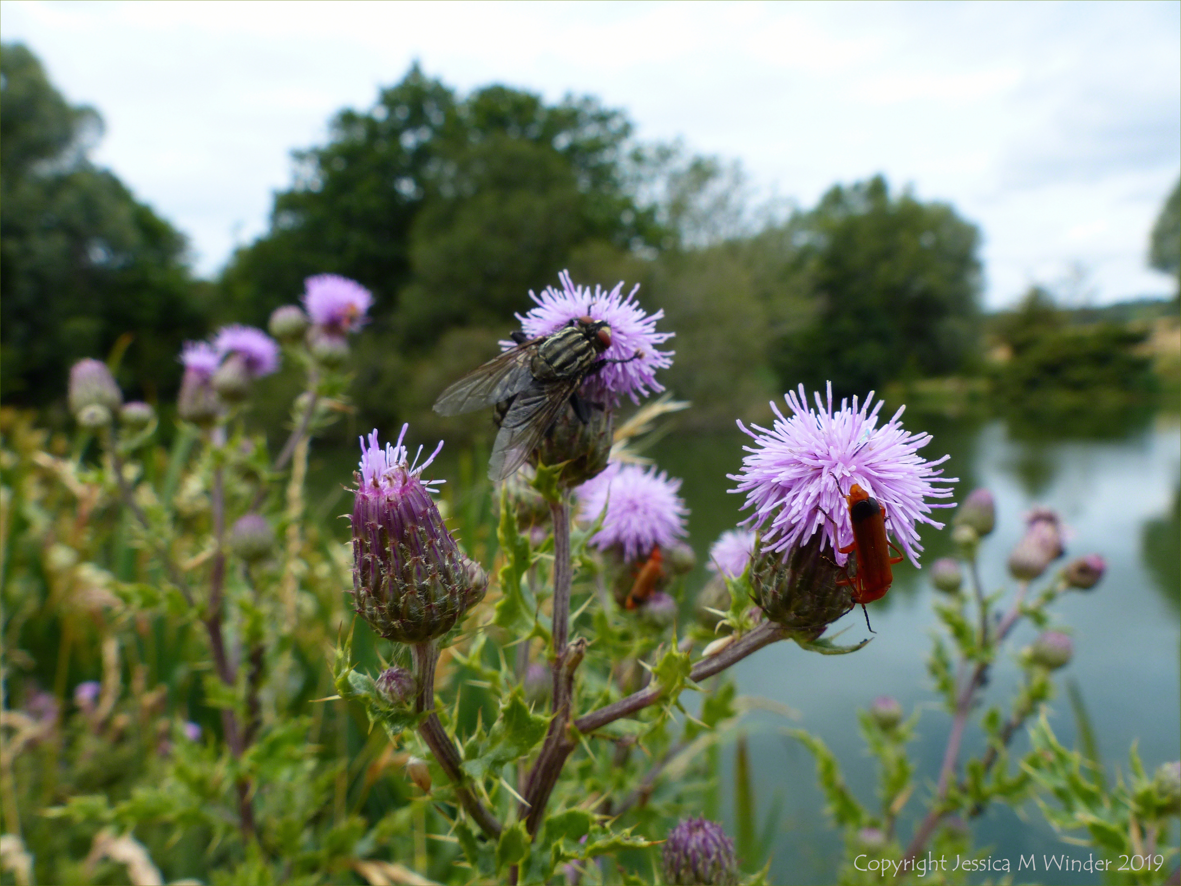 Pallington Lakes 28 SBTL07.19 Waterside wild flowers with insects at “Sculpture by the Lakes” near Tincleton in Dorset July 2019