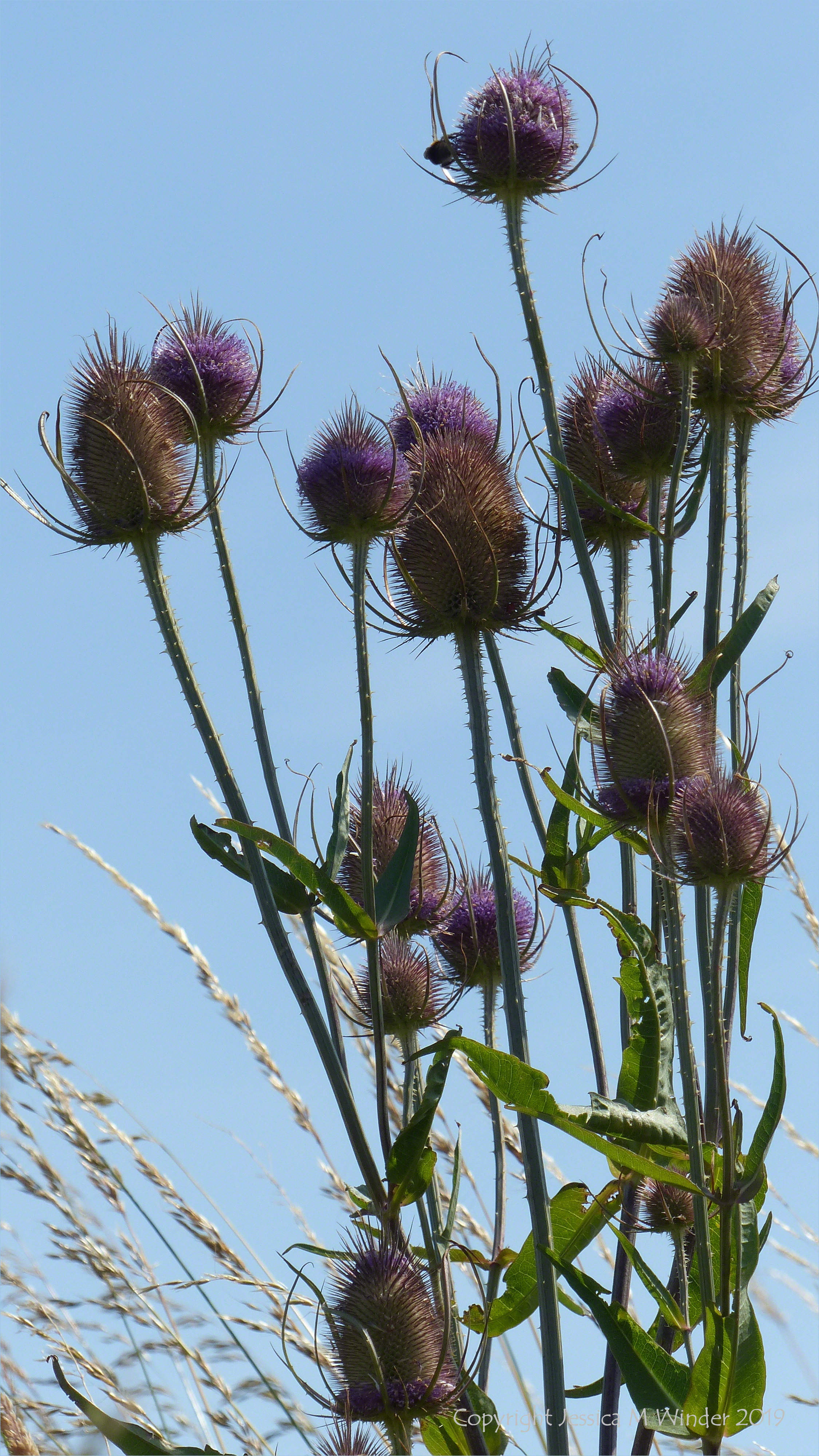 Flowering teasels and other plants sown by the National Trust to provide food for insects and birds on the medieval field system called The Vile at Rhossili in Gower, South Wales, August 2019.