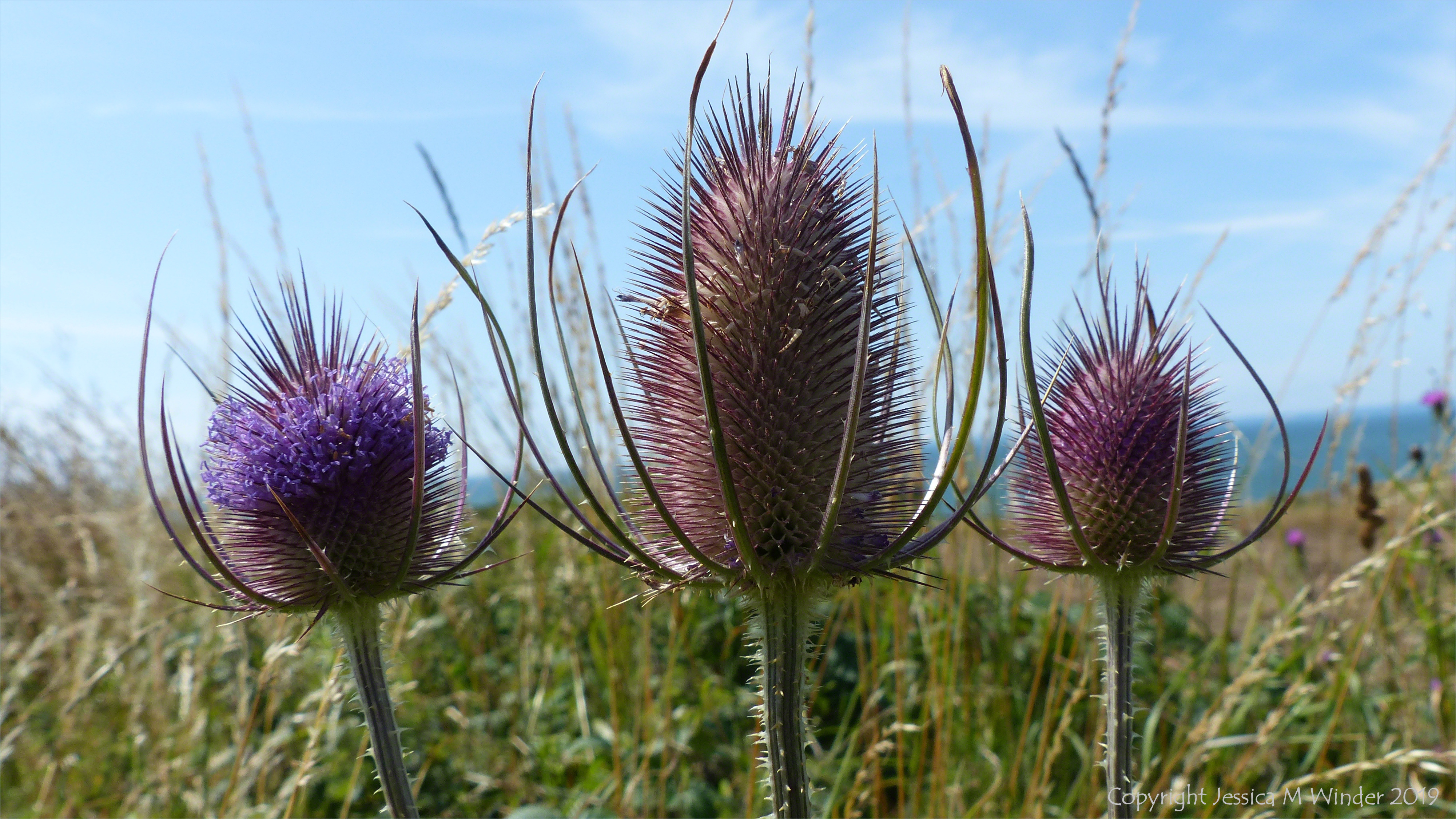 Flowering teasels and other plants sown by the National Trust to provide food for insects and birds on the medieval field system called The Vile at Rhossili in Gower, South Wales, August 2019.