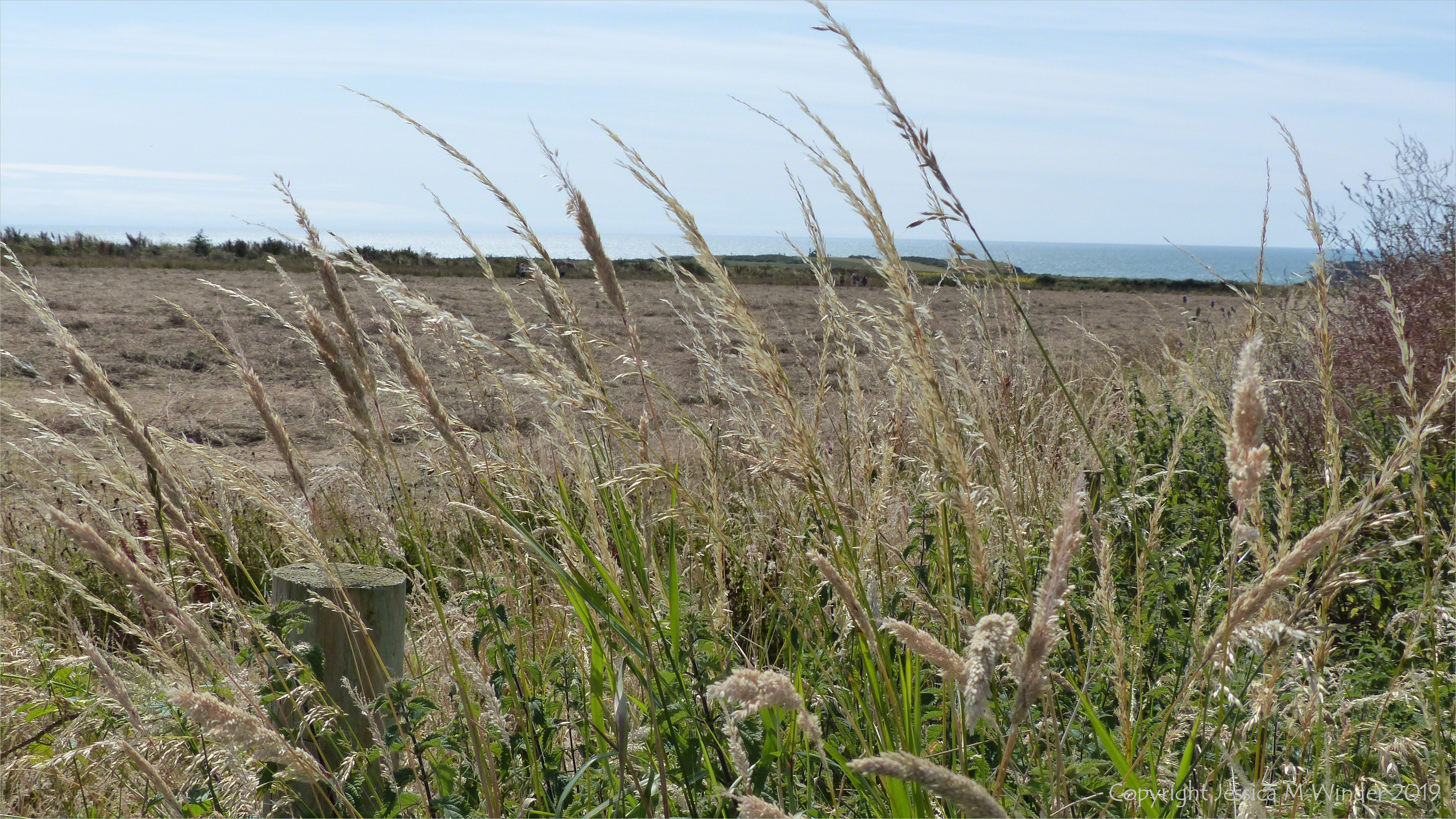 Grasses and other plants sown by the National Trust to provide food for insects and birds on the medieval field system called The Vile at Rhossili in Gower, South Wales, August 2019.