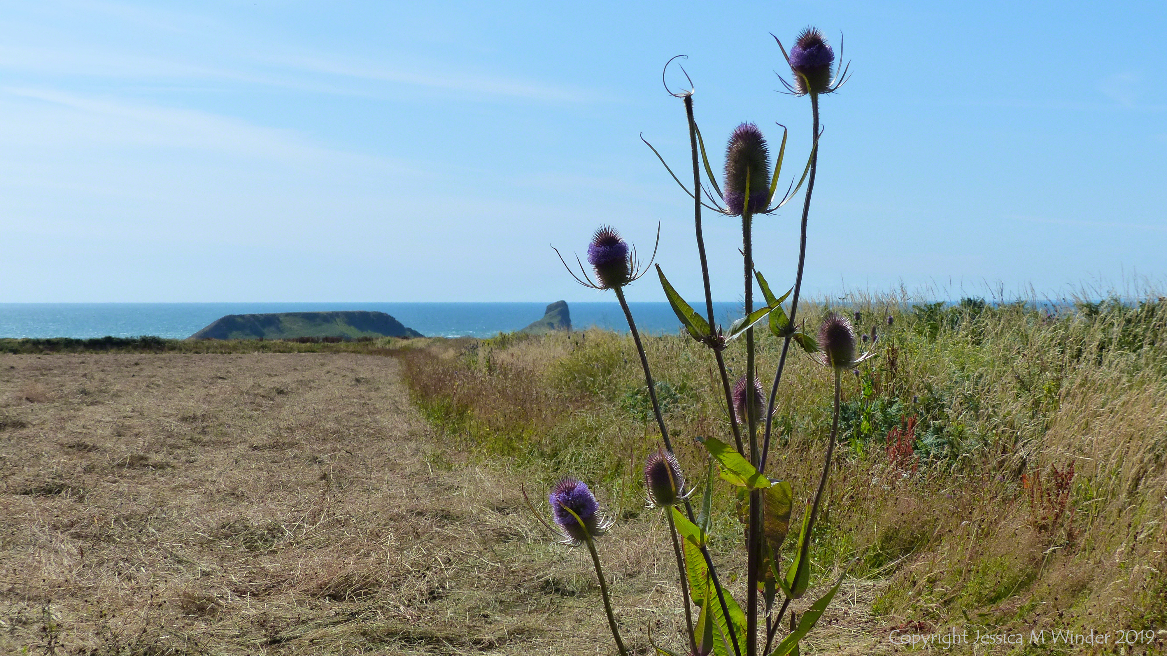 Teasels and other plants by a freshly mown hay meadow sown by the National Trust to provide food for insects and birds on the medieval field system called The Vile at Rhossili in Gower, South Wales, August 2019.