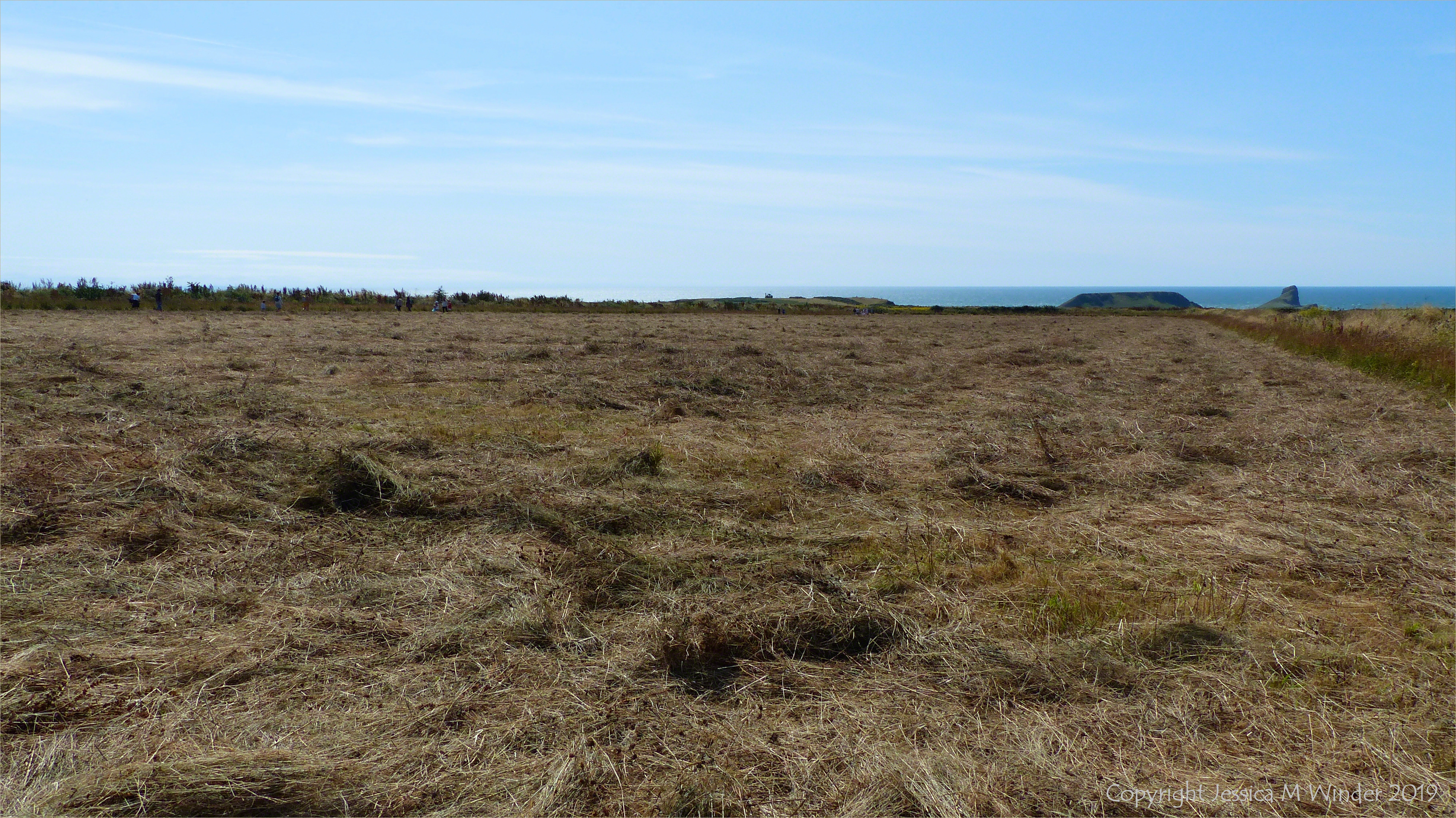 Newly mown hay meadow sown by the National Trust to provide food for insects and birds on the medieval field system called The Vile at Rhossili in Gower, South Wales, August 2019.