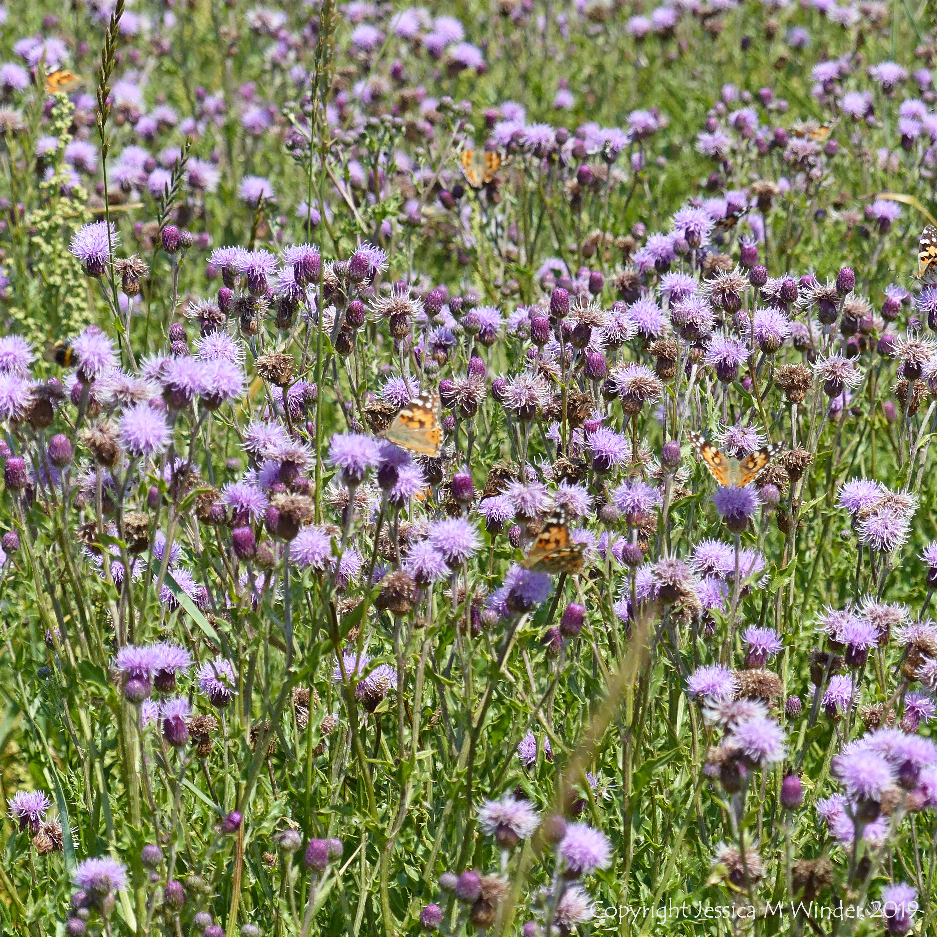 Painted Lady butterfly (Vanessa cardui Linne.) on Knapweed flowers (Centaurea sp.) sown by the National Trust at the old medieval strip field system on The Vile at Rhossili in Gower, South Wales, August 2019.