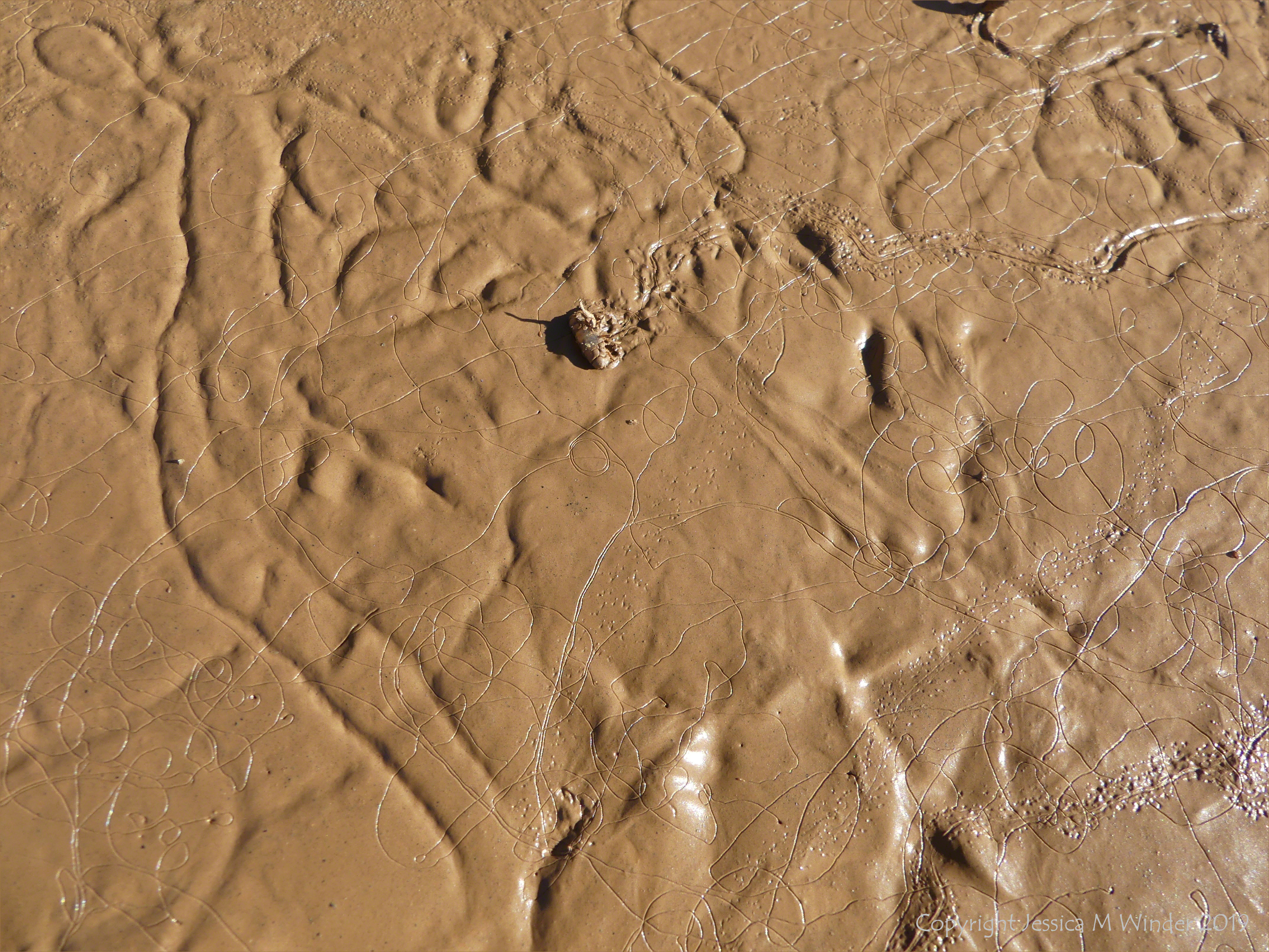 Orange sediments with tracks and trails of small marine invertebrates washed down by heavy rain at the south end of on Rhossili beach on the Gower Peninsula