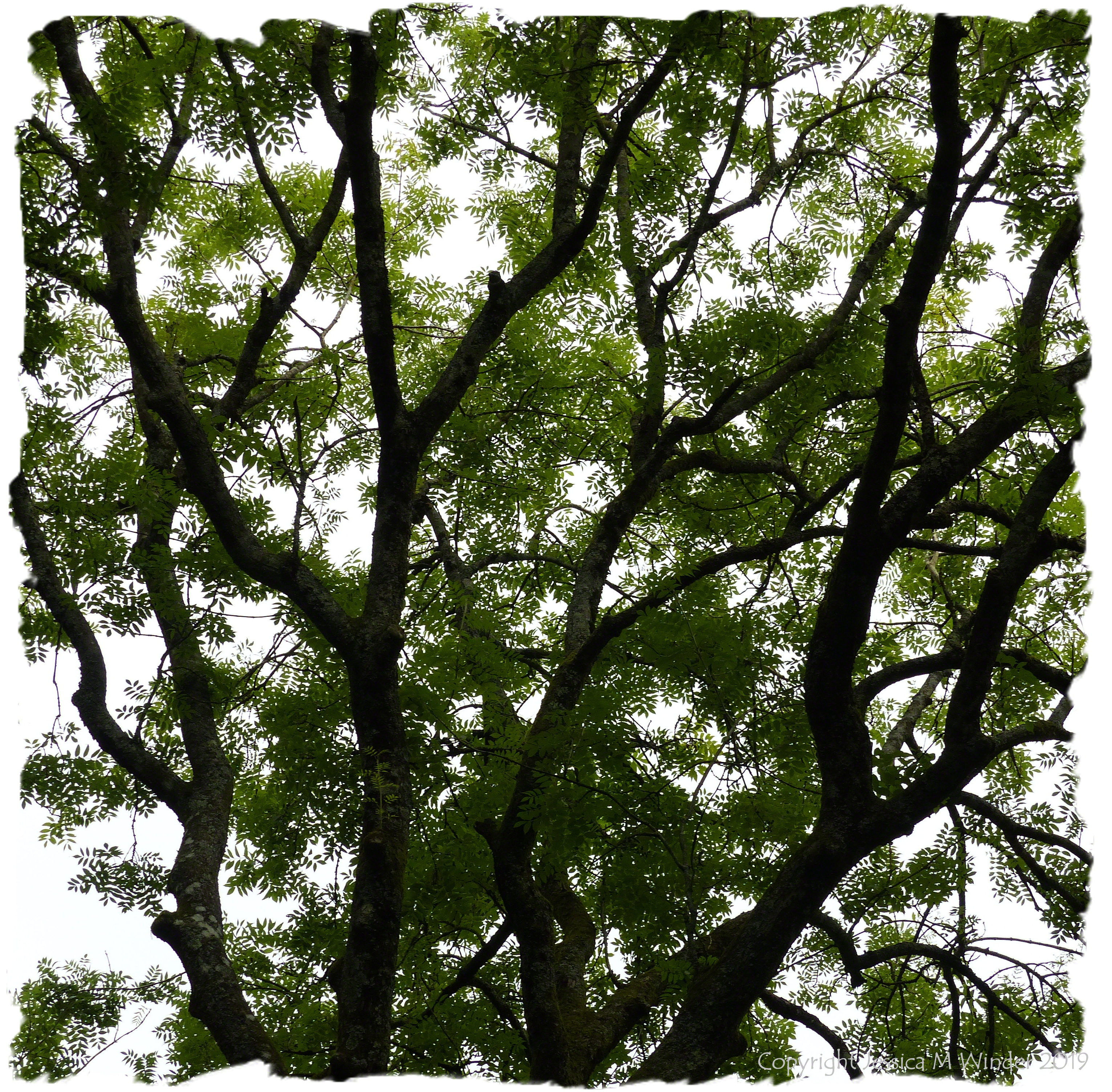 Looking up into the tree top with its pattern of branches, and leaves silhouetted against the sky, makes me feel small but peaceful and at one with Nature (Pontypool Park August 2019).