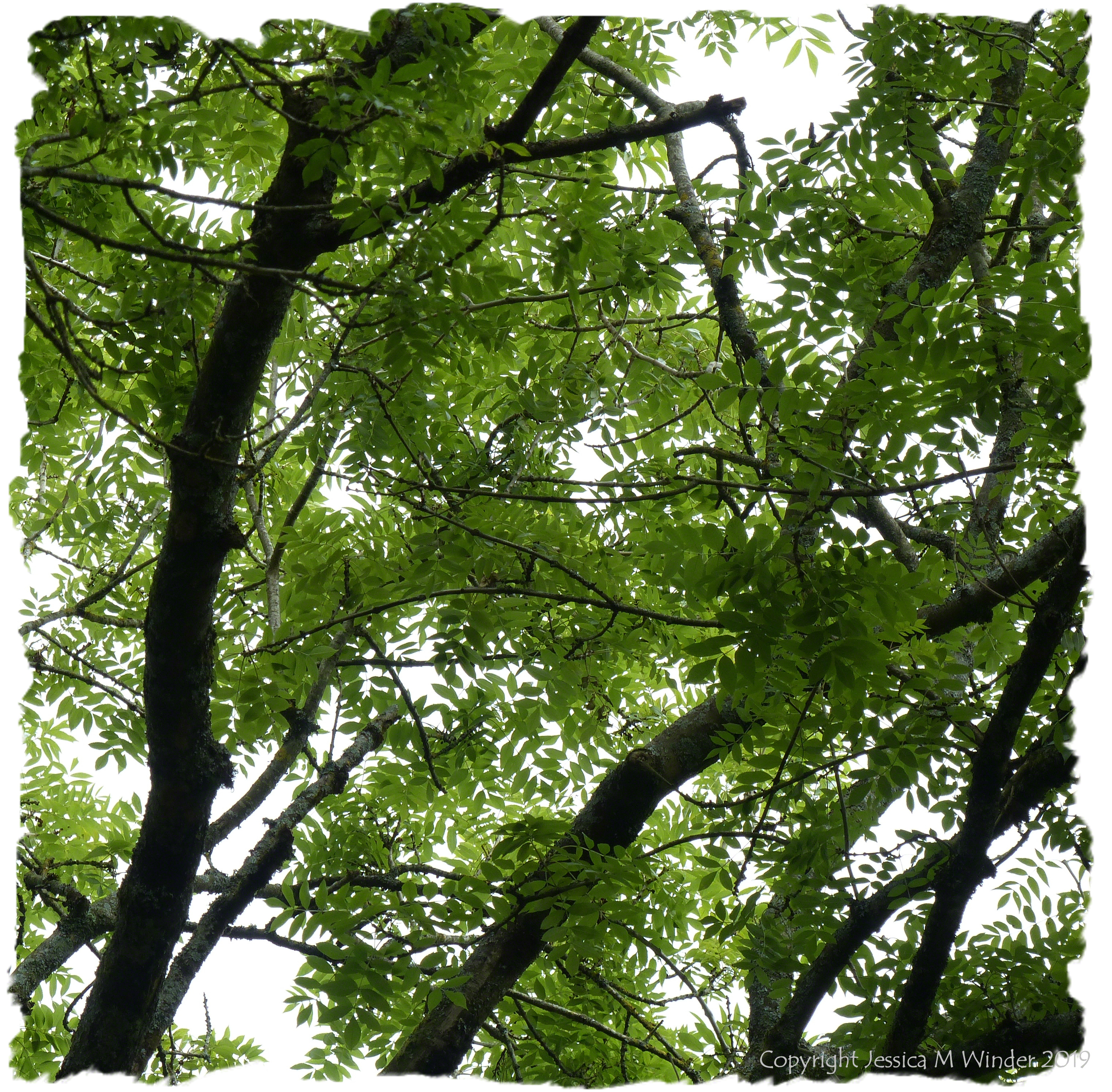 Looking up into the tree top with its pattern of branches, and leaves silhouetted against the sky, makes me feel small but peaceful and at one with Nature (Pontypool Park August 2019).