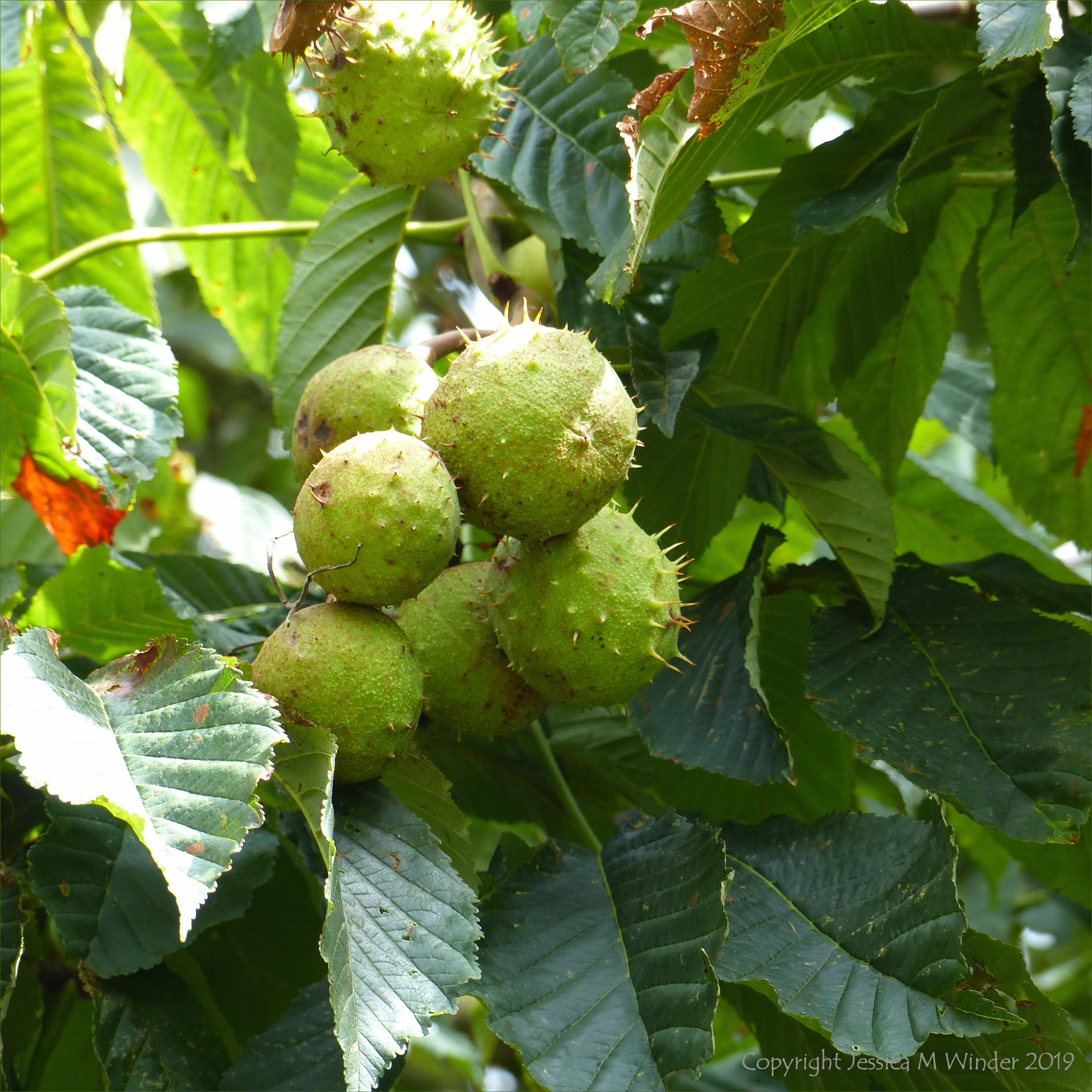 Pallington Lakes 46 SBTL08.19 Conkers on the tree in the gardens at Sculpture by the Lakes, Pallington, Dorset August 2019